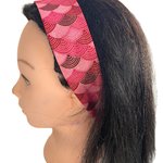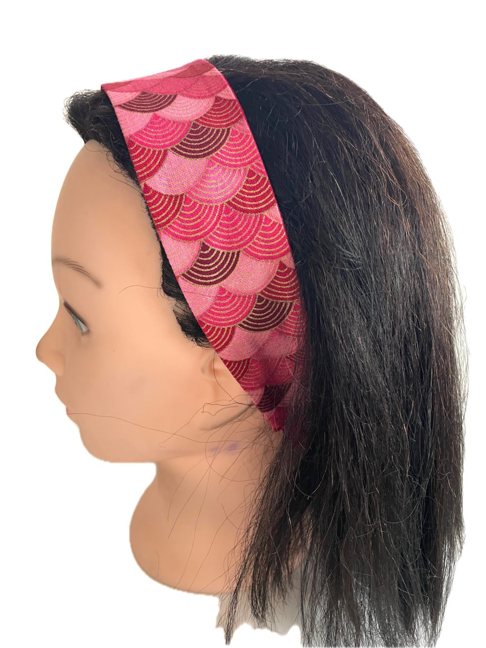 Bandeau cheveux femme 100% coton imprimé d'éventails rouge, rose et doré.