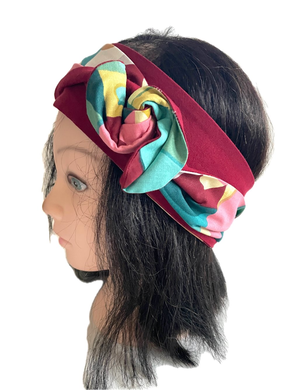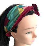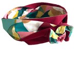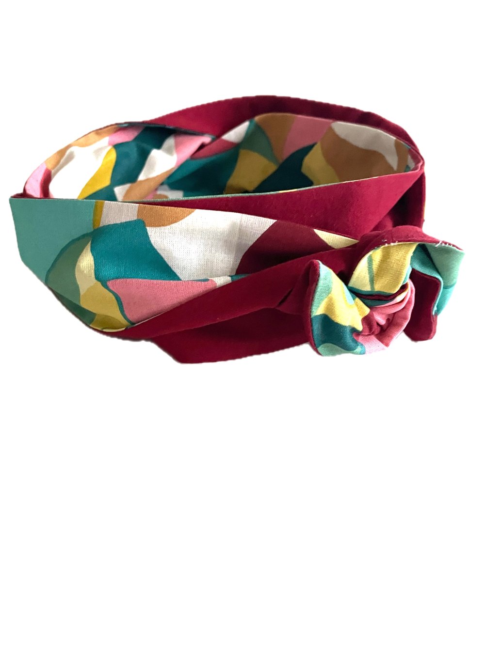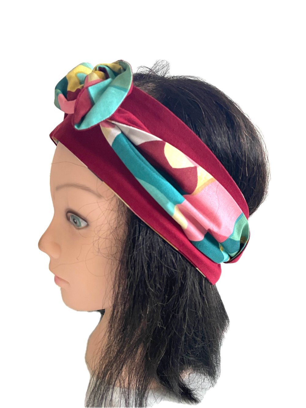 Bandeau cheveux femme 100% coton imprimé multicolore d'un coté et uni rouge foncé de l'autre pour un rendu très pétillant et tendance