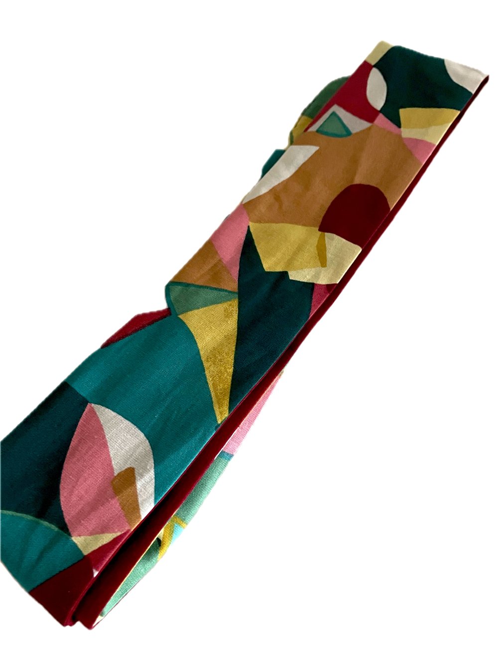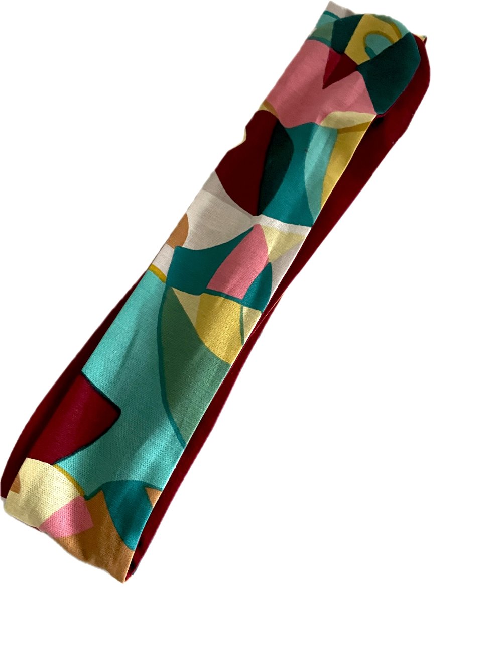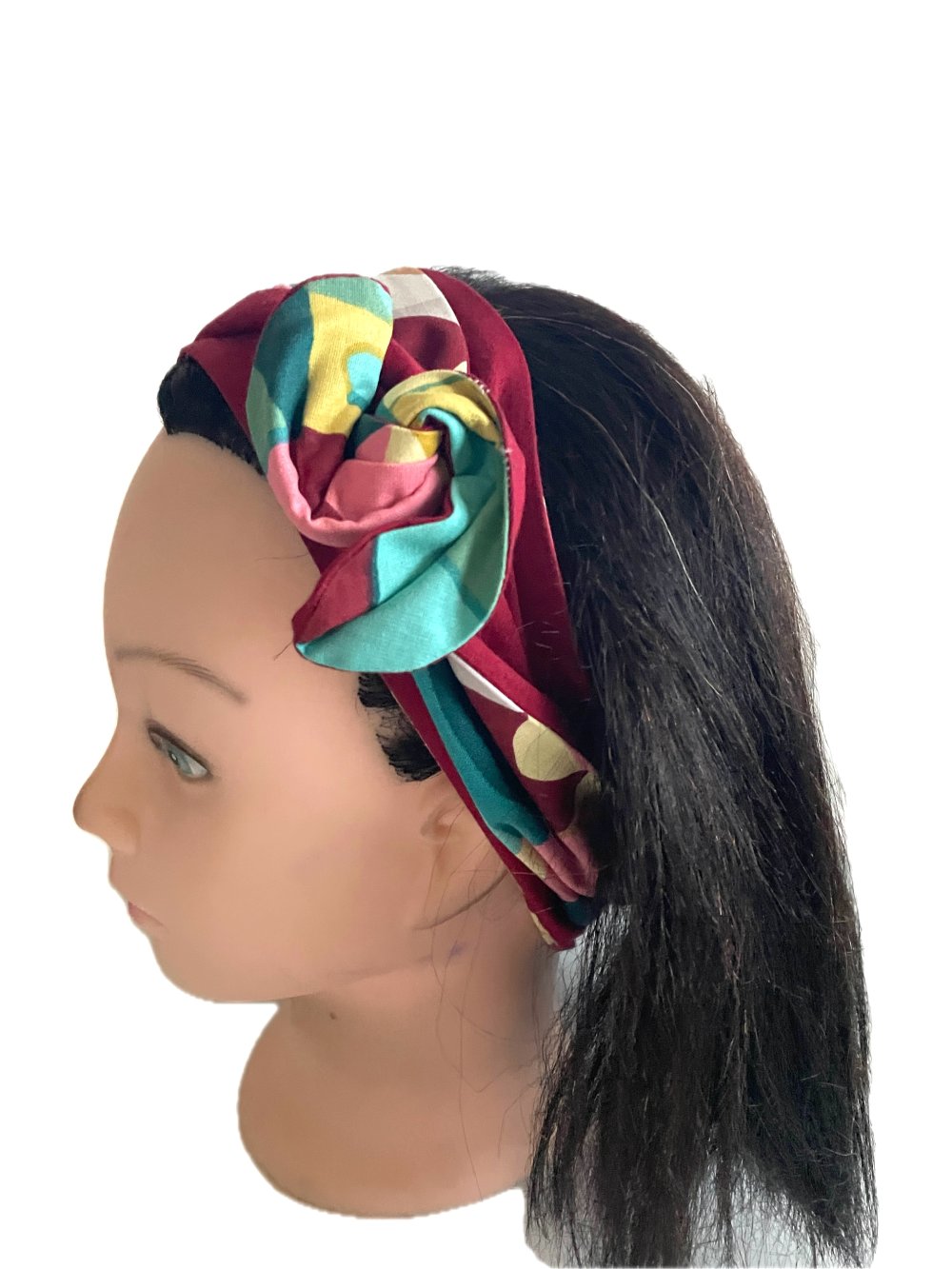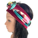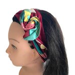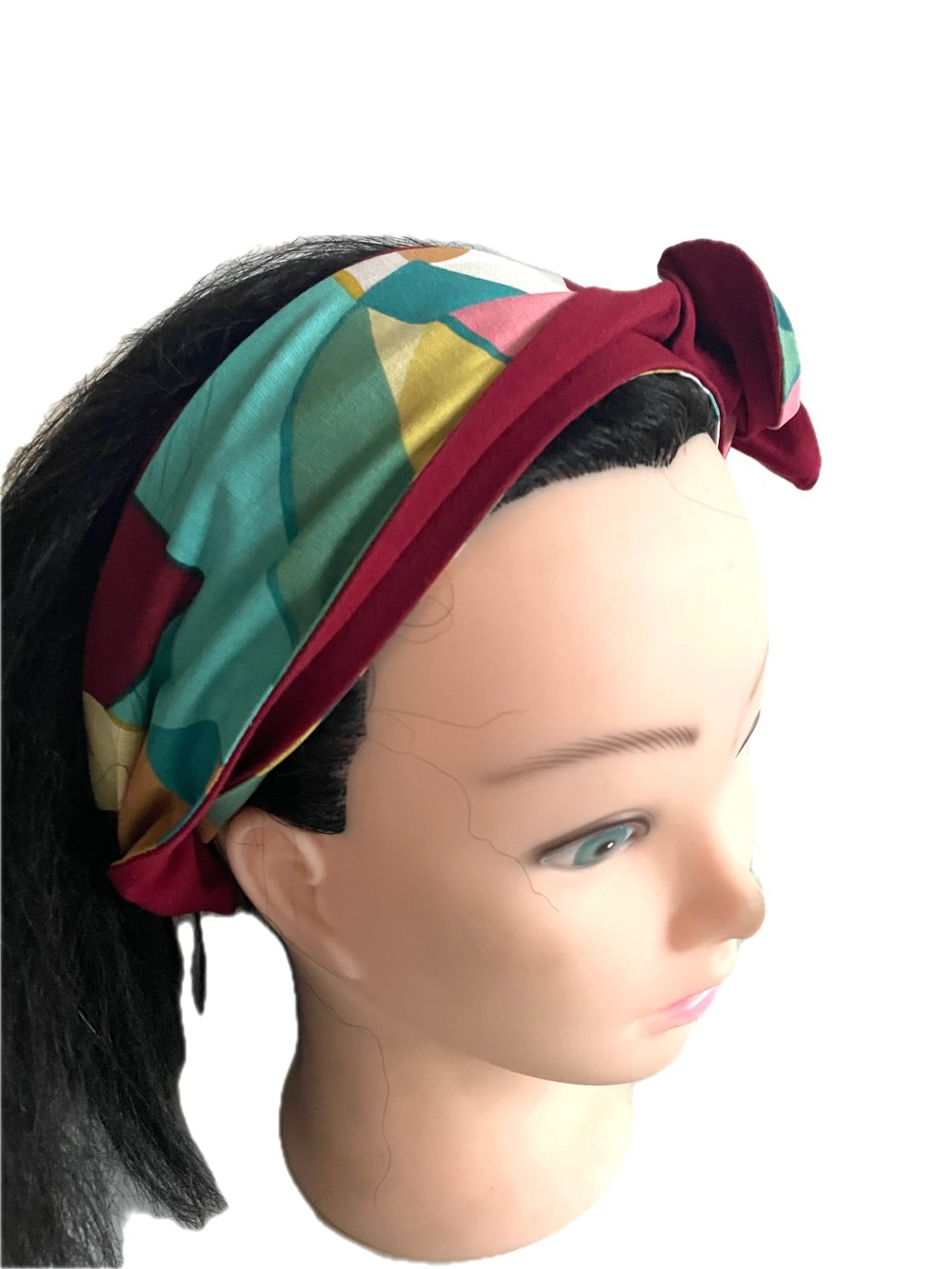 Bandeau cheveux femme 100% coton imprimé multicolore d'un coté et uni rouge foncé de l'autre pour un rendu très pétillant et tendance
