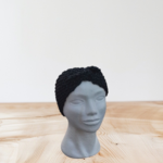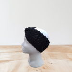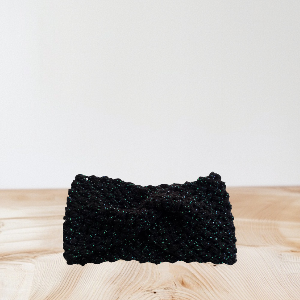 Joli bandeau large en laine noire pailleté de vert, fait main.