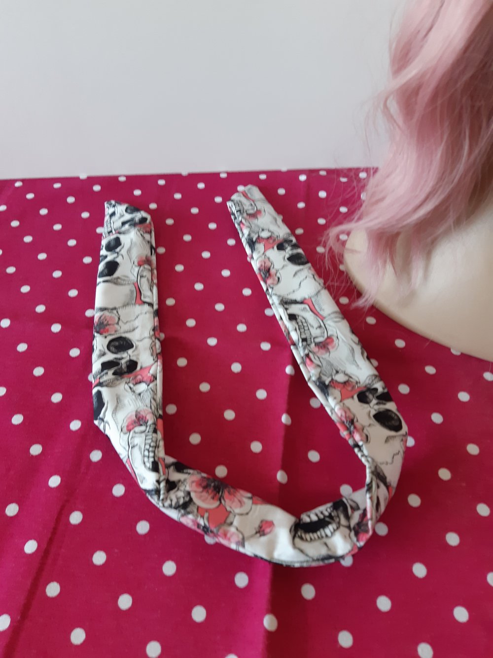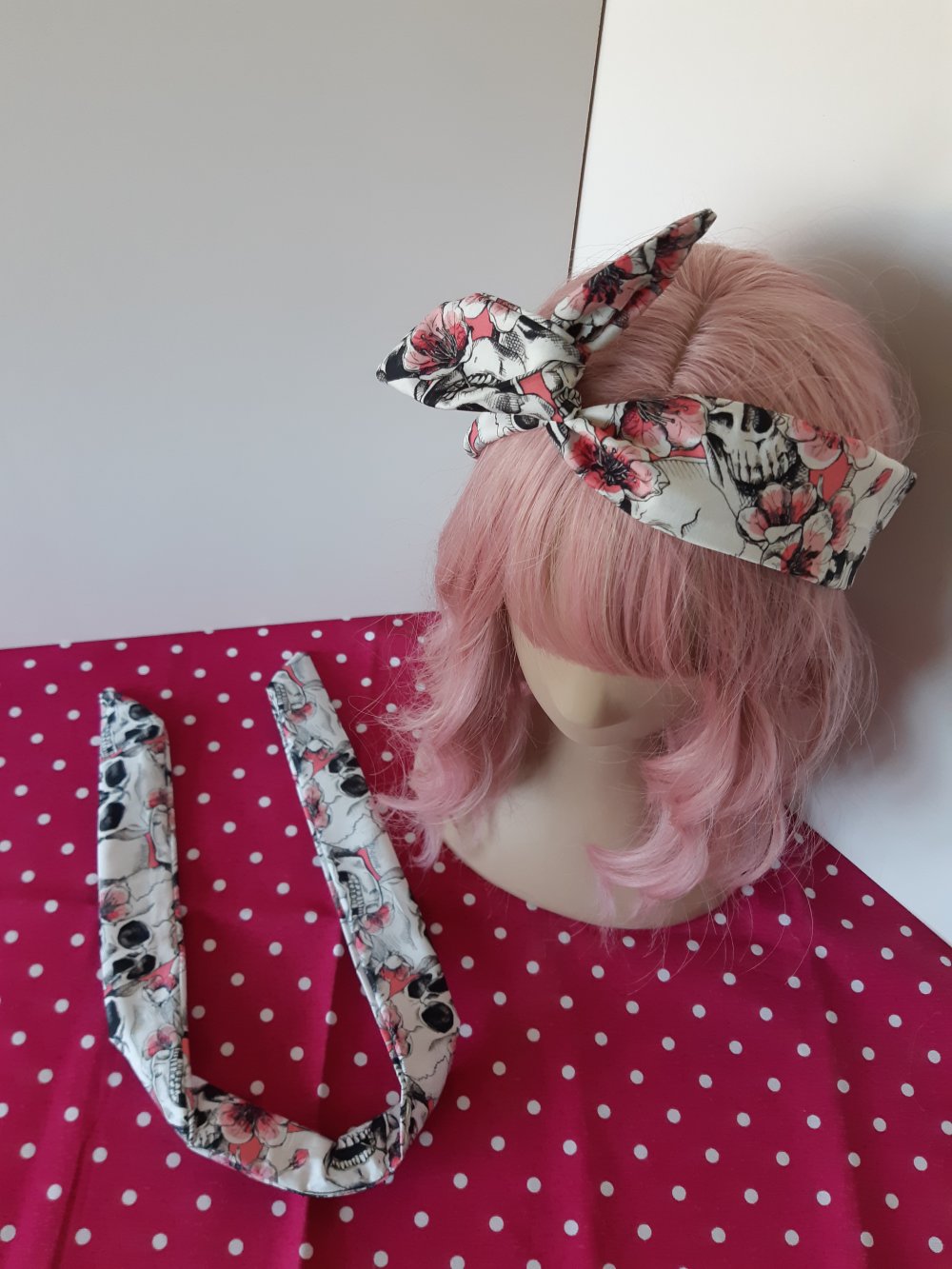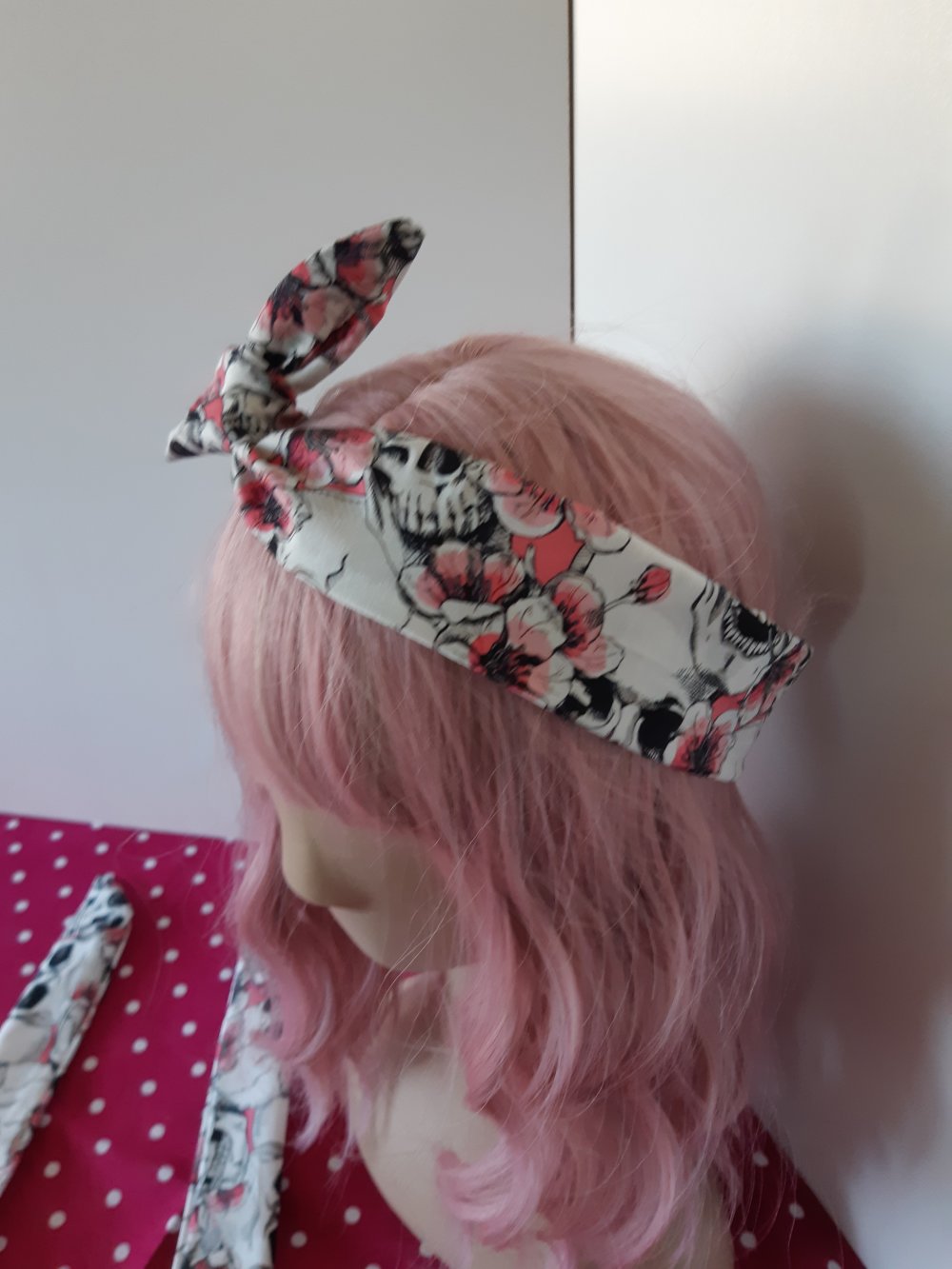 Superbe bandeau à cheveux sur fil d'acier afin qu'il soit souple et solide tout en étant inoxydable, et en coton aux motifs crânes et fleurs de cerisier sur fond blanc, un peu gothique, un peu emo, et surtout féminin !