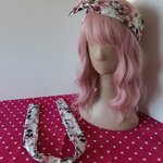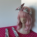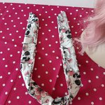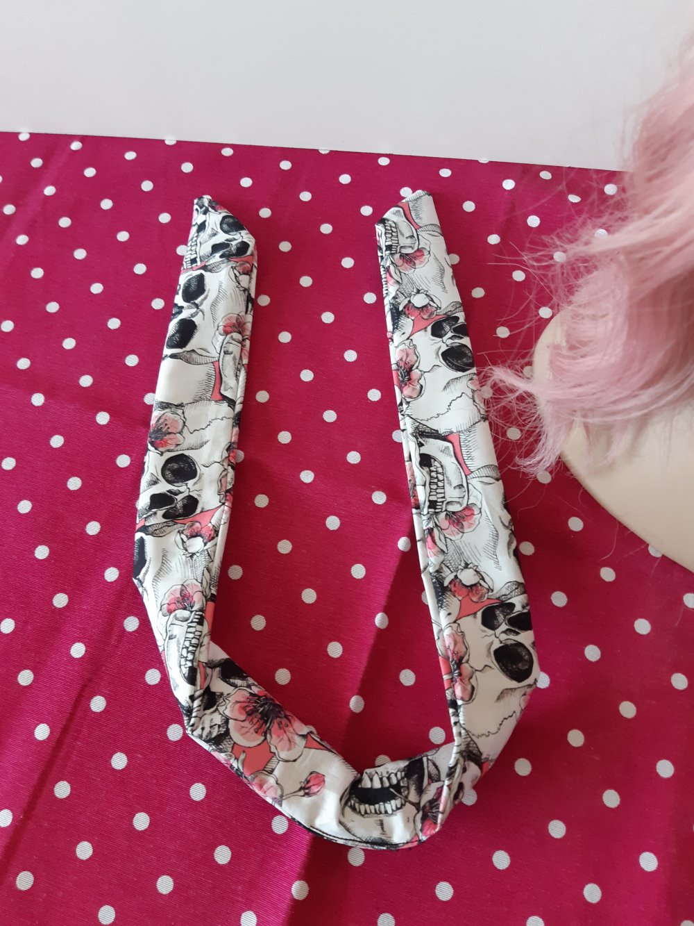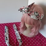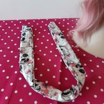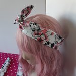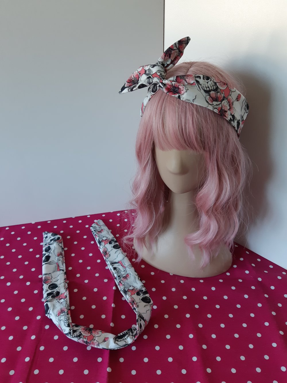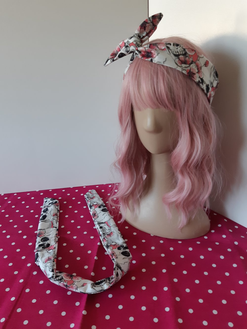 Superbe bandeau à cheveux sur fil d'acier afin qu'il soit souple et solide tout en étant inoxydable, et en coton aux motifs crânes et fleurs de cerisier sur fond blanc, un peu gothique, un peu emo, et surtout féminin !