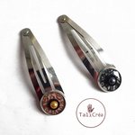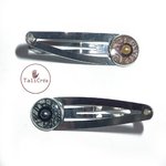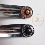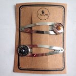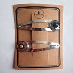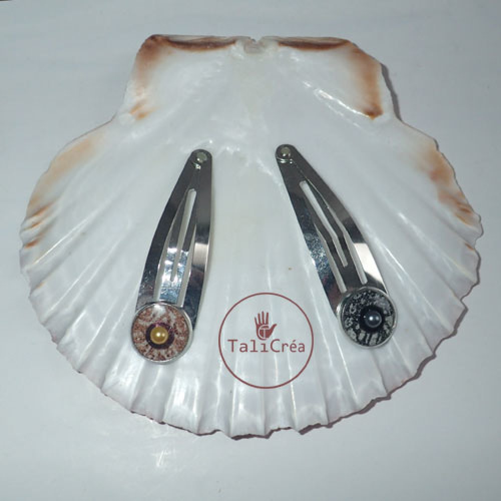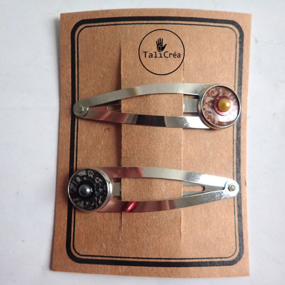 Lot de 2 barrettes clic clac argentées, avec cabochon à motifs en sable rouges, blancs, noirs et strass.