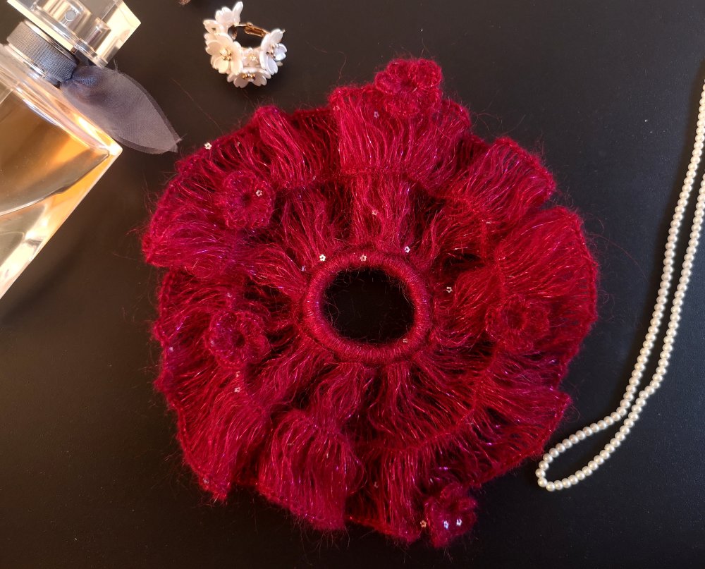 Ces chouchous délicatement crochetés en fil mohair fin et scintillant apportent une touche de glamour discret à votre coiffure. Leur texture légère et vaporeuse capte la lumière avec élégance, tandis que les fils pailletés ajoutent une note raffinée et festive.