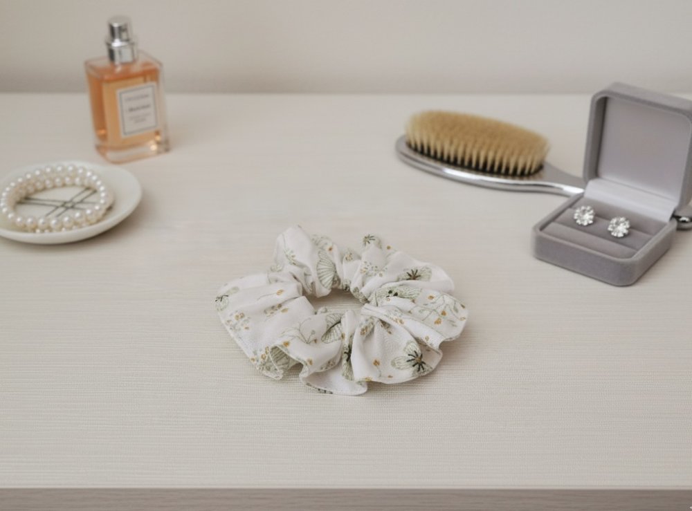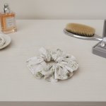 Chouchou coton blanc à fleurs vertes