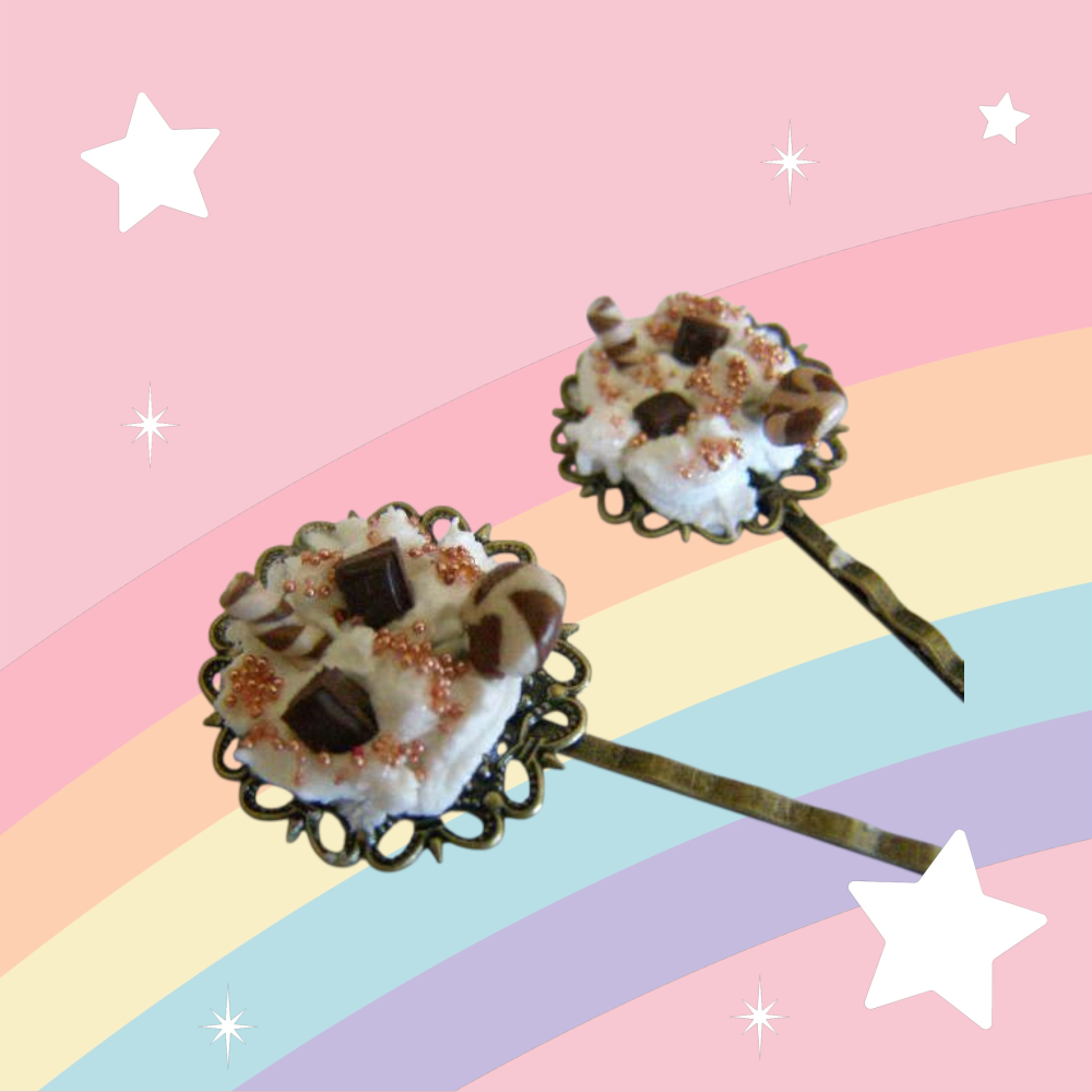 2 pinces à cheveux gourmandes, ornées d'une crème et de friandises, réalisées en Fimo.