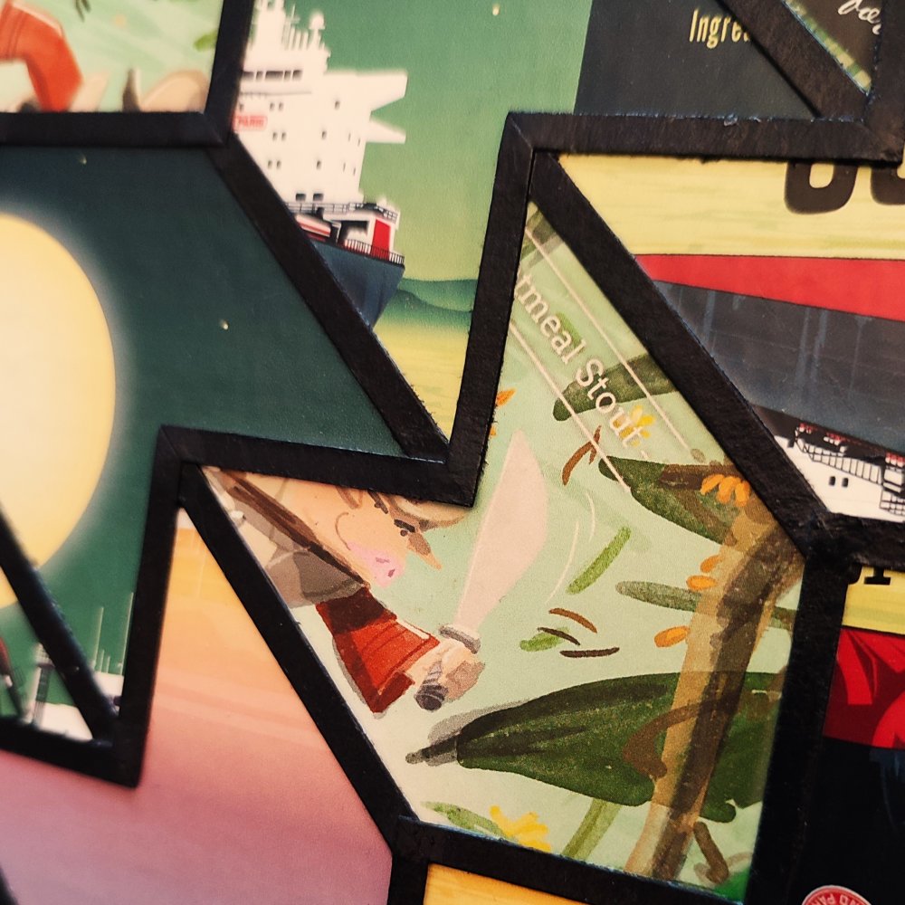 Trois types différents d’étiquettes de bières craft ont été utilisé pour réaliser ce tableau, toutes rattachées au style « stout » (des bières brunes riche en goût et qui tiennent au corps !), un style que j’affectionne particulièrement.
