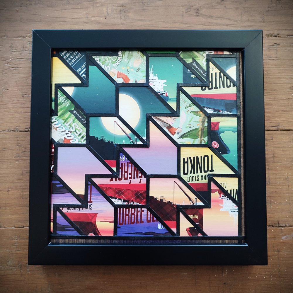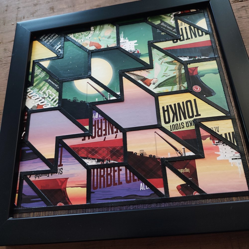 Tableau réalisé avec des étiquettes de bières craft et du papier-peint upcyclé, collage fait-main, pièce unique, décoration murale, collage géométrique, art original.
