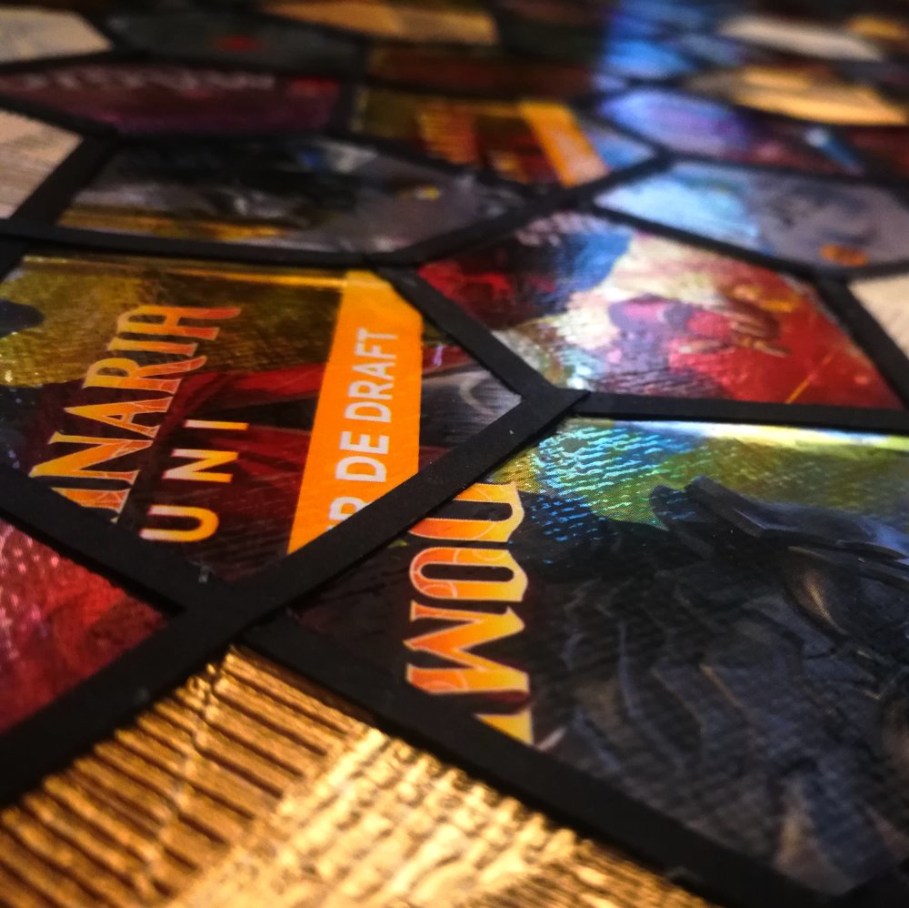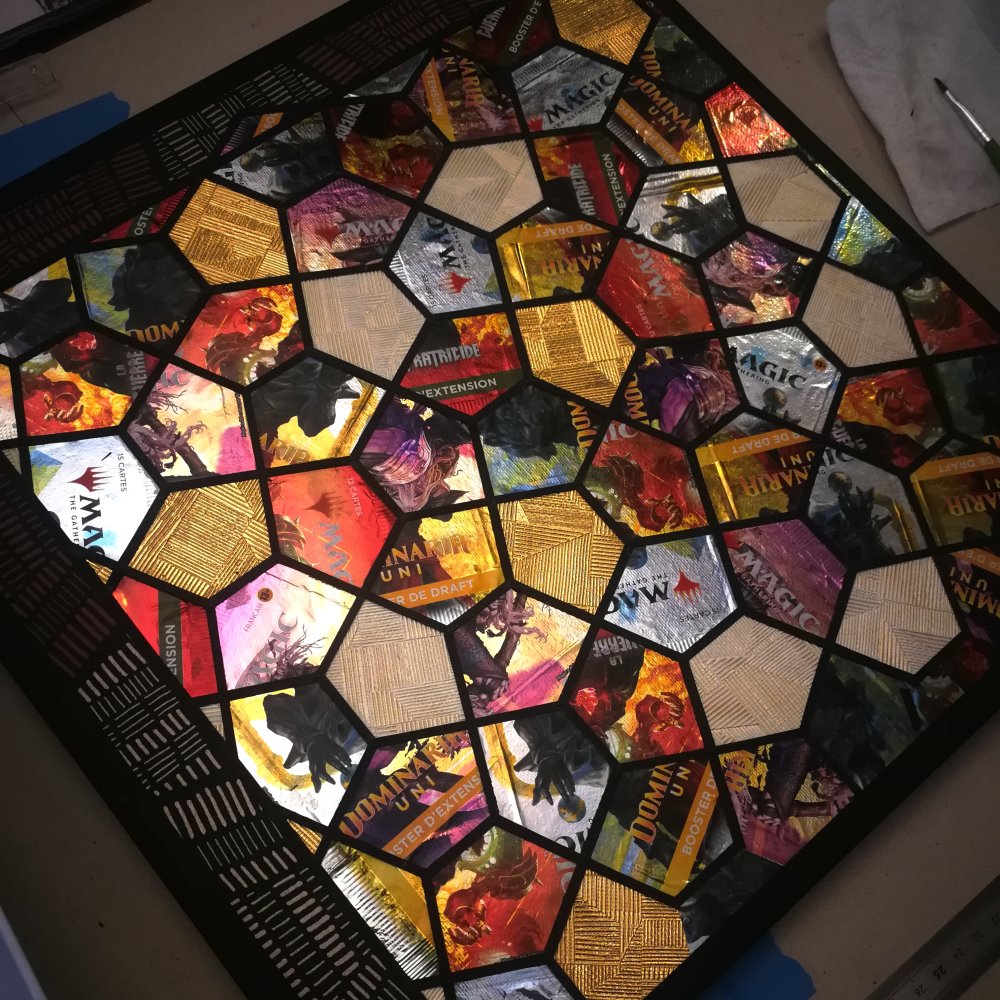 Ce tableau mêle l’univers du jeu de cartes à collectionner Magic avec des papiers-peint upcyclés : trois types de sachet en aluminium ont été utilisé, provenant de différentes extensions du jeu, allant du rouge profond au parme délicat ; le tout est réhaussé par un papier-peint métallisé et une bordure texturée mate, dont le velouté vient tempérer en douceur le clinquant de ce collage audacieux.