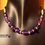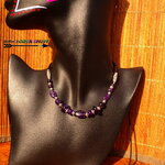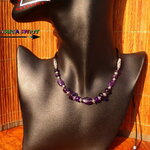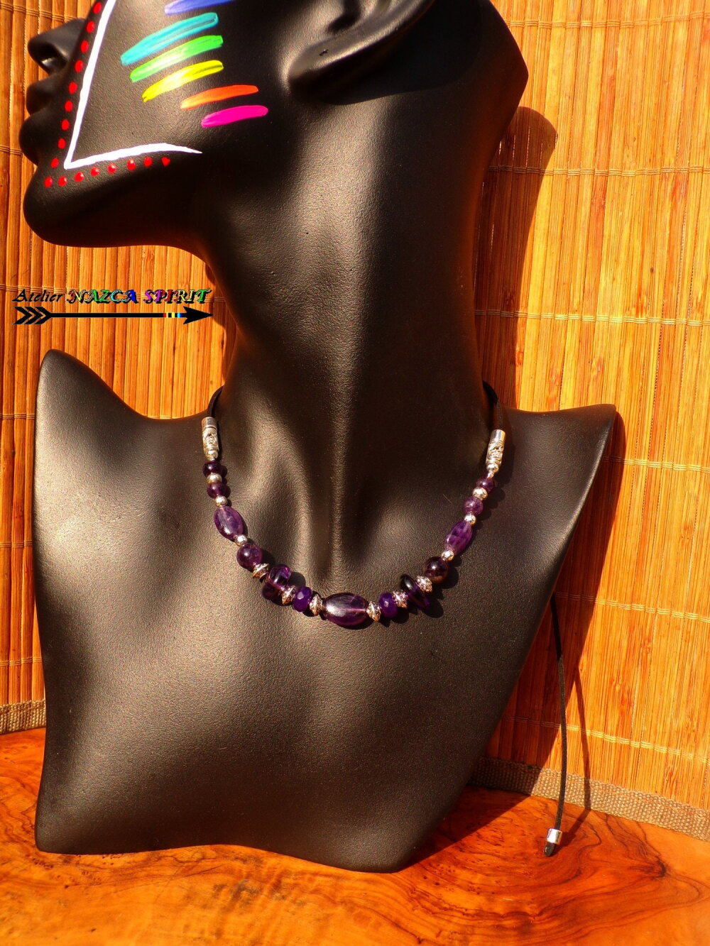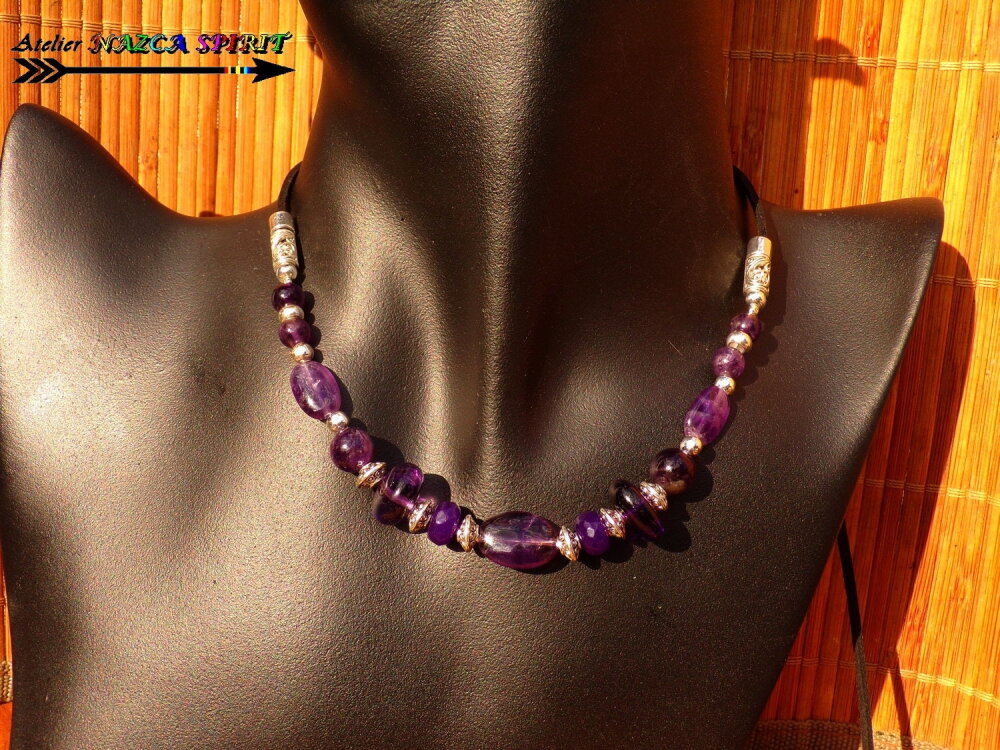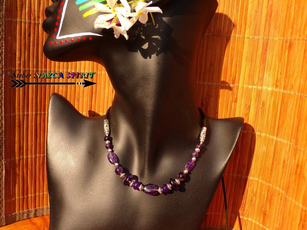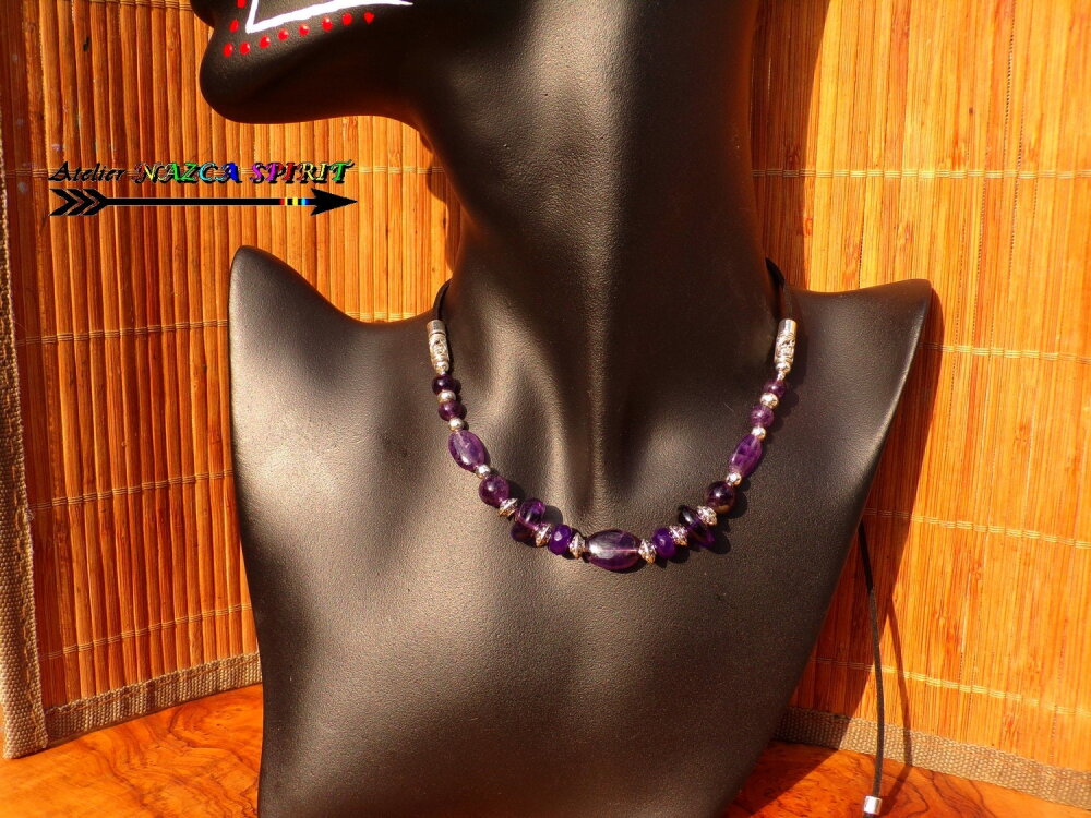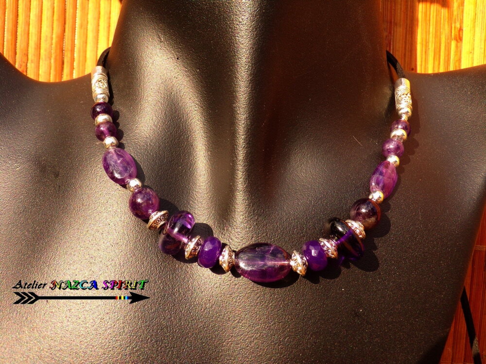 J'ai réalisé intégralement ce collier réglable d'inspiration bohème chic à partir de lacet suédine effet cuir noir, d'un câble en acier gainé, de perles en véritable améthyste (origine : France), de perles rondes en cuivre plaqué argent et de perles soucoupes ciselées plaqué argent.