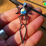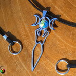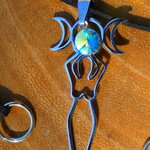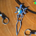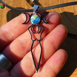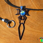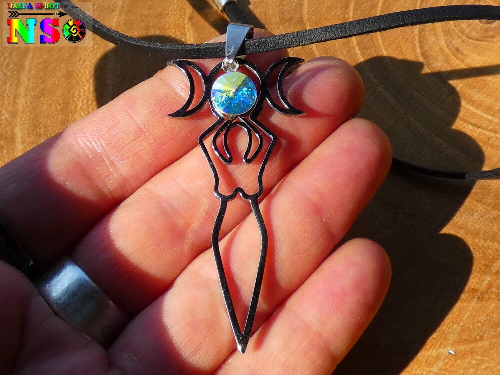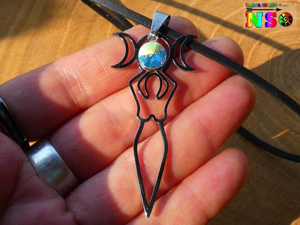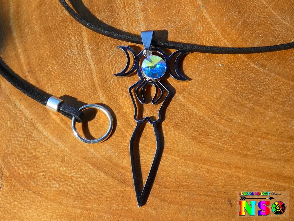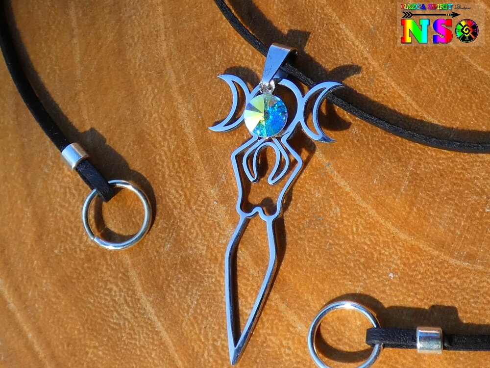 Je vous propose de découvrir un magnifique collier ajustable inspiré des bijoux magiques witchcraft. Il s'agit d'un collier ajustable réalisé à partir d'un lacet en daim suédé noir effet finition cuir sur lequel j'ai relié un superbe pendentif représentant la déesse de la fertilité tenant entre ses mains au dessus de sa tête les 3 principales phases d'apparition de l'astre lunaire. Ici vous avez la phase pleine lune, puis les deux phases en croissants de lune.