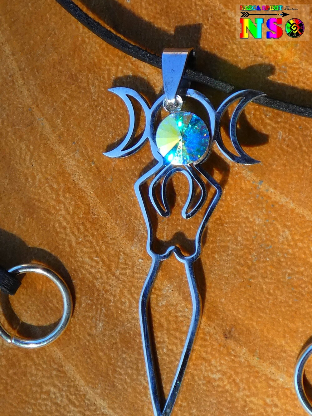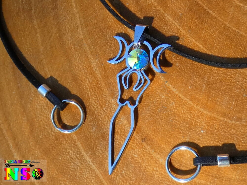 Collier Ajustable Bohème Ethnique Déesse de la Fertilité en Acier Inoxydable Ciselé - Bijou Acier et Cristal Facetté Autrichien Aurore Boréale.