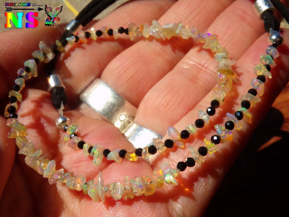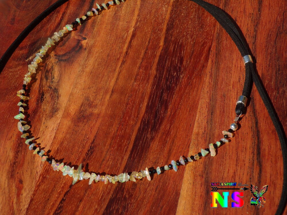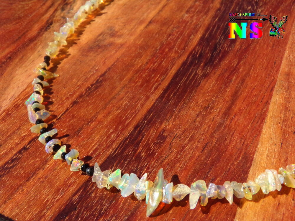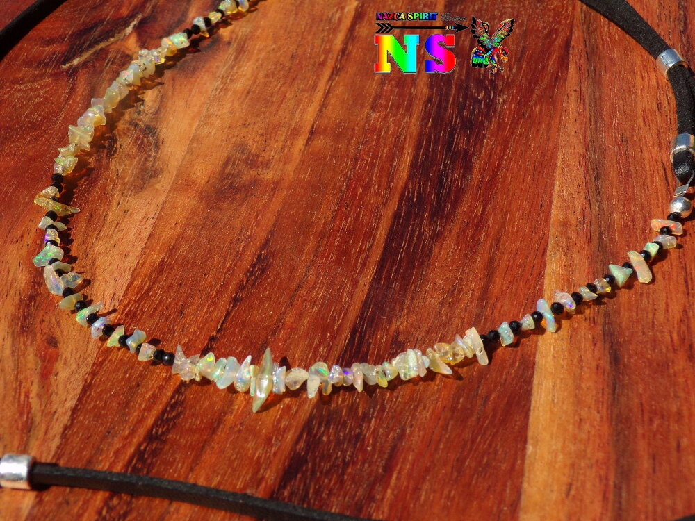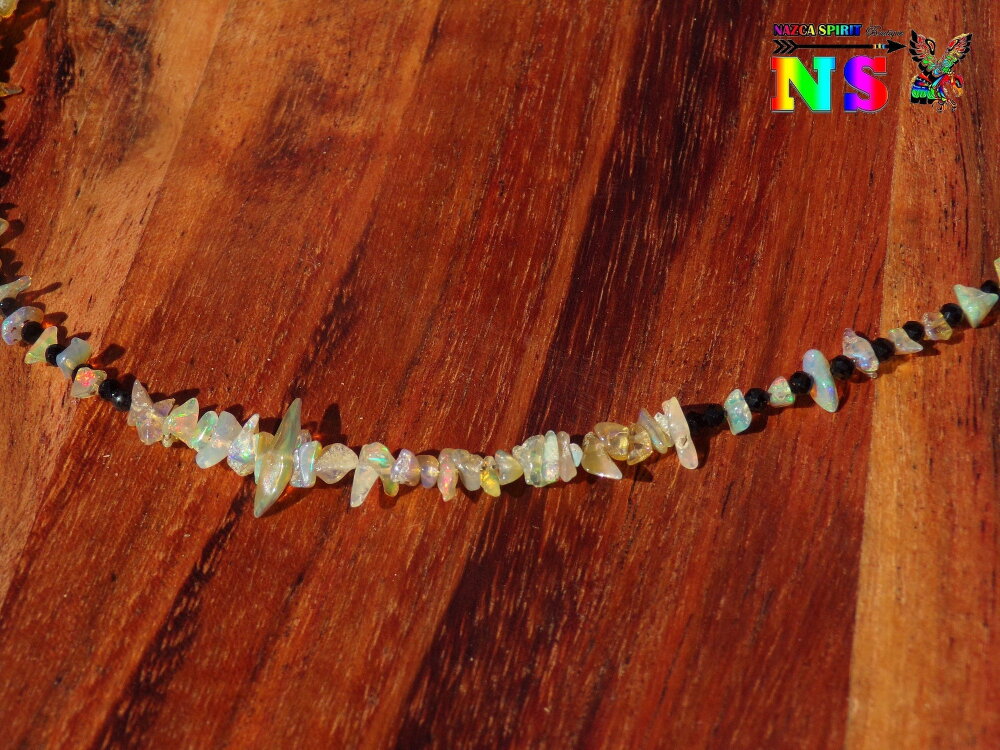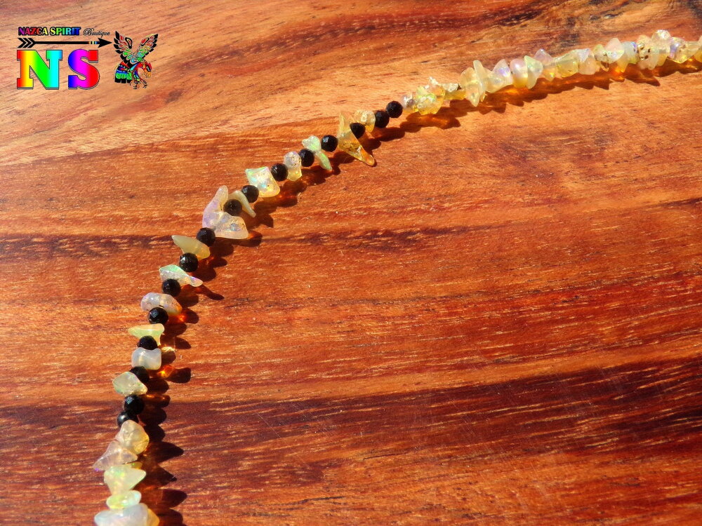 Collier Ajustable Bohème Ethnique en Opales Naturelles Welo Ethiopie - Collier Perles Chips d'Opales Arc-en-Ciel et Spinelles Noires
