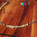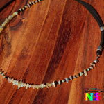 J'ai réalisé ce superbe collier ajustable aux notes bohème ethnique à partir de lacet en daim suédé effet cuir pour réaliser le tour de cou réglable, de câble d'acier pour enfiler mes perles chips d'opale et spinelles noires et de perles tubes en alliage tibétain.