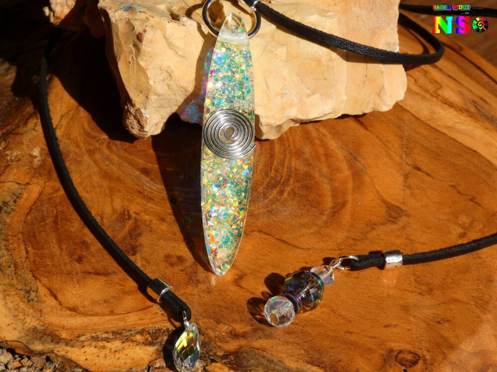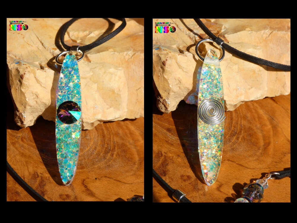 Le bijou est Ultra iridescent. Grâce à l'insertion de particules extrêmement iridescentes, le pendentif offre de multiples feux iridescents lorsqu'il est exposé sous la lumière solaire ou artificielle.