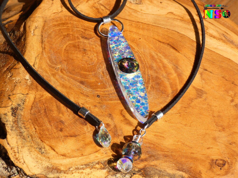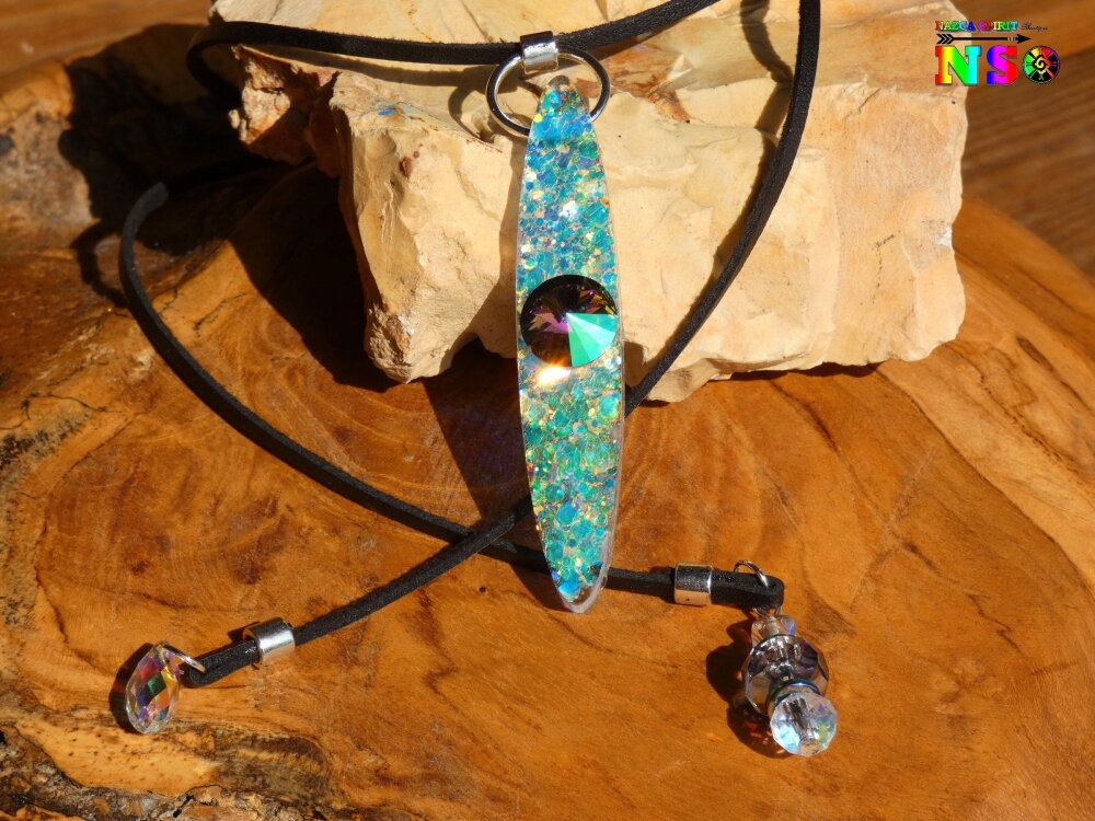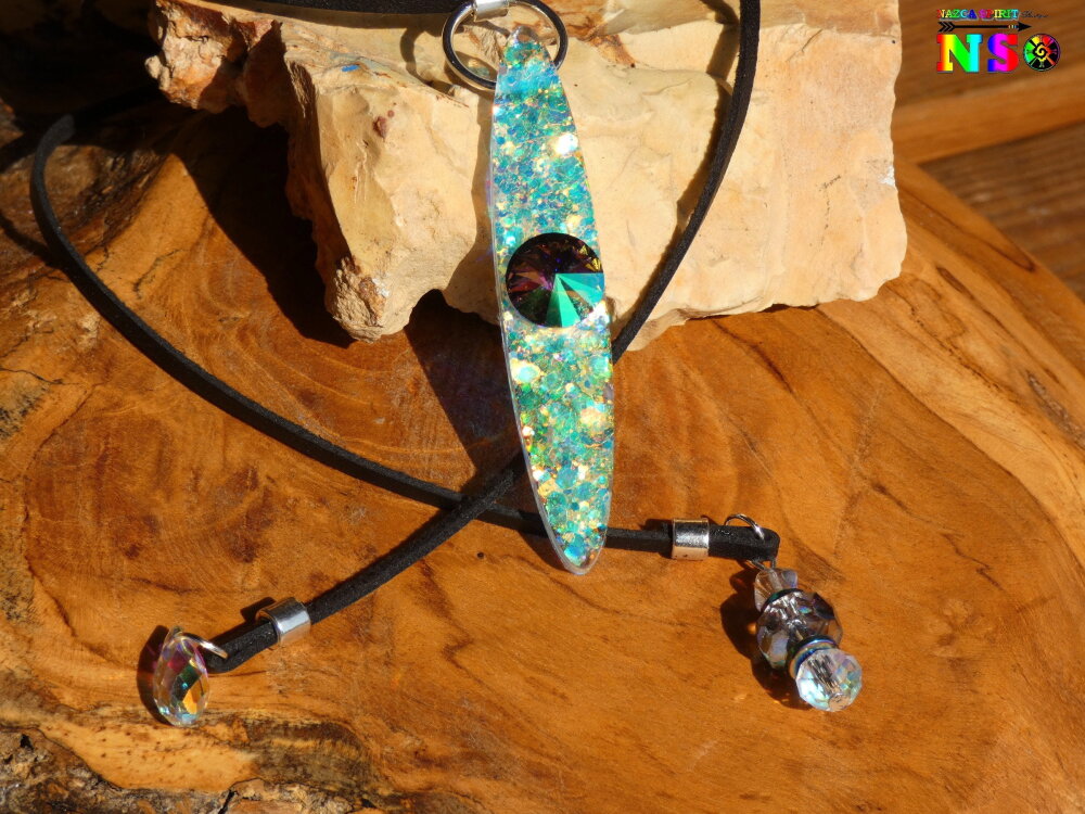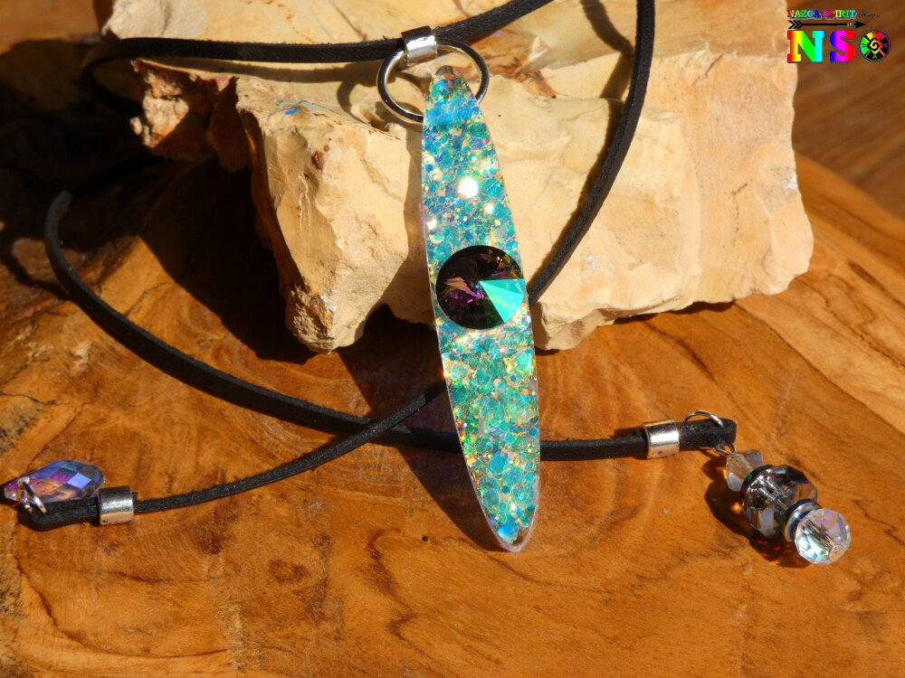 Matériaux : résine cristal, particules iridescentes, cuivre plaqué argent, cristal autrichien, daim suédé effet finition cuir