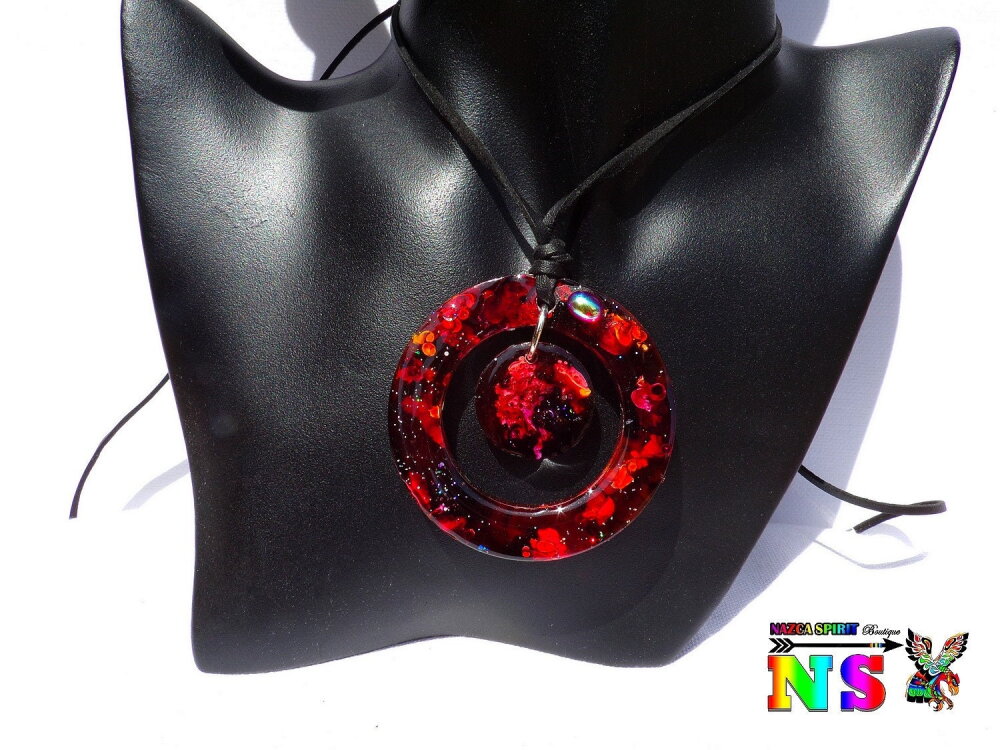 Collier Ajustable Boho Bohème - Esprit Seventies - Peau Effet Cuir - Pendentif Aristanal Résine-Cercles Transparents Multicolores Iridescent.