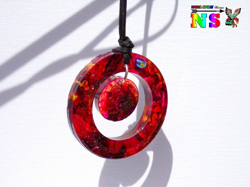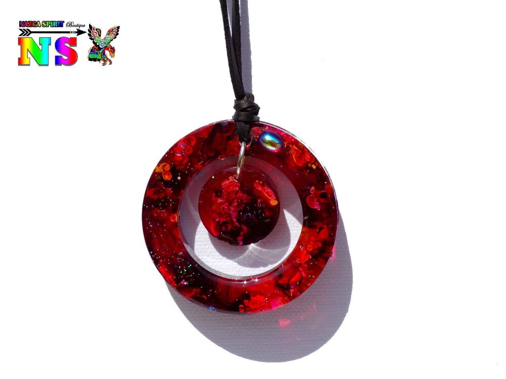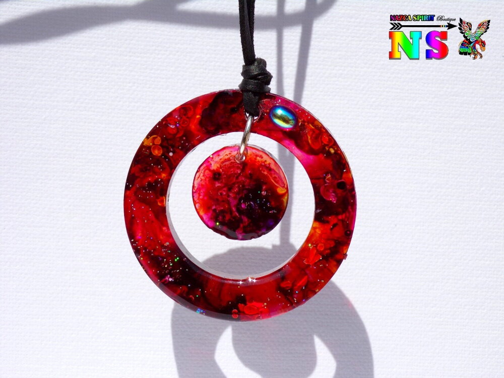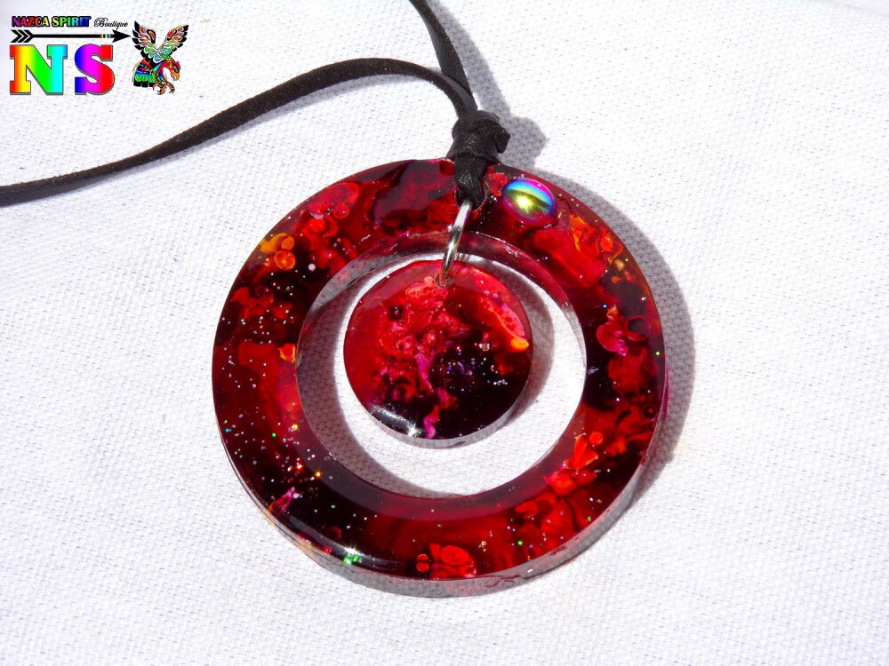 Le grand pendentif en forme de cercle multicolore ainsi que le disque fixé en son centre ont été réalisés à l'aide de résine cristal et de colorants auquel j'ai ajouté des pigments iridescents pour apporter une note lumineuse supplémentaire à cette création aux notes seventies.