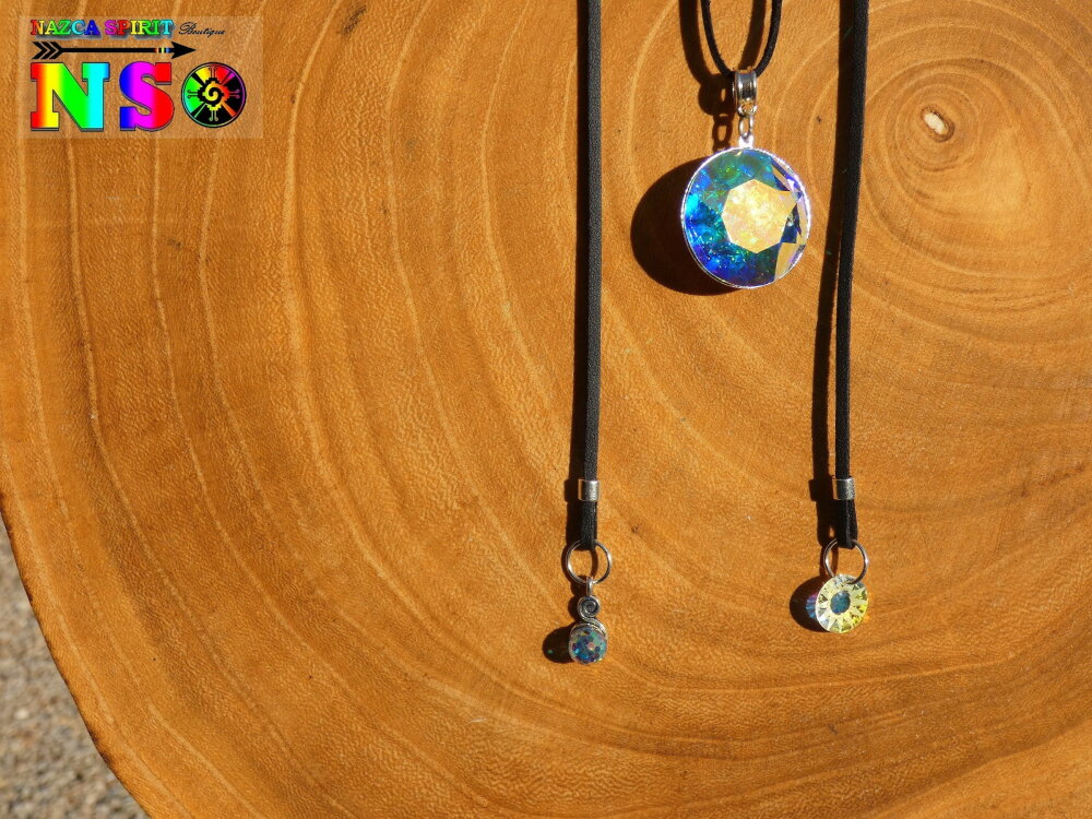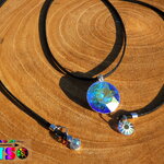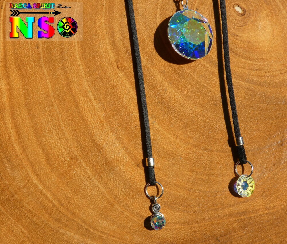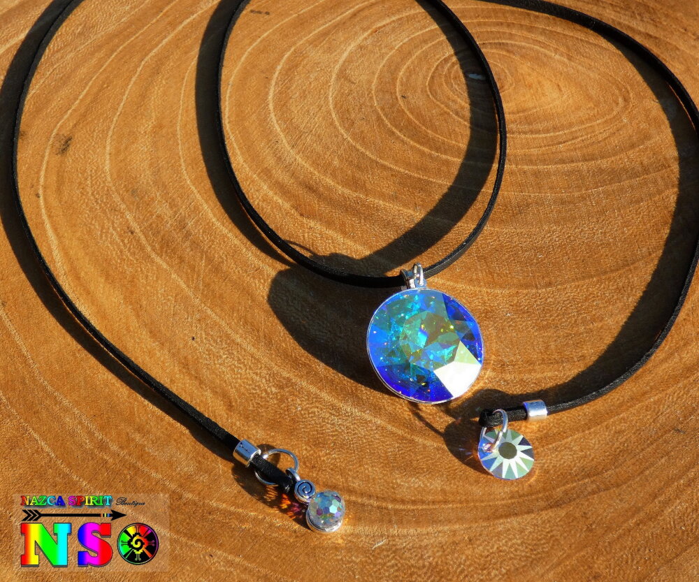 Je vous propose de découvrir une toute nouvelle création qui vient de s'ajouter à ma gamme de bijoux en cristal Autrichien. Il s'agit d'un collier d'inspiration boho bohème ajustable Ultra lumineux. J'ai réalisé ce collier aux lueurs hypnotiques intégralement à la main à partir d'un lacet en daim suédé noir effet finition cuir, d'un pendentif serti en cuivre plaqué argen, d'un grand cristal Chaton facetté de 3 cm ("1.18) de diamètre couleur aurore boréale autrichien et d'une jolie bélière Design en cuivre plaqué argent.