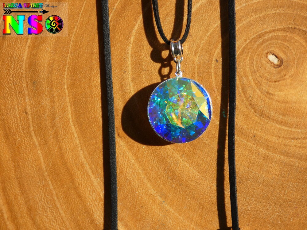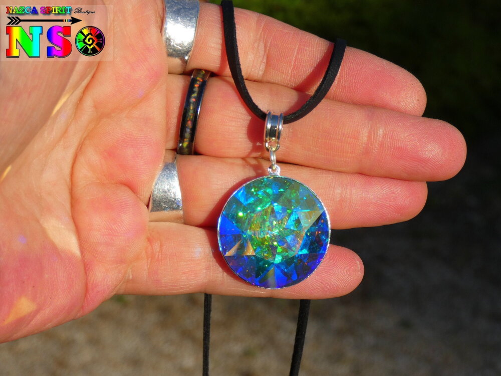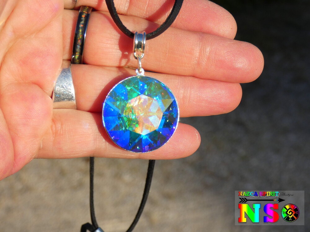 Collier Ajustable Boho Bohème Pendentif Grand Cristal Autrichien Aurore Boréale Serti sur Monture Plaqué Argent- Bijou Femme Ultra Lumineux.