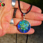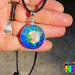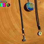 Les pendants situés à chaque bout du tour de cou ont été réalisés à partir de grands anneaux en cuivre plaqué argent, d'une perle facettée Sun couleur aurore boréale et d'un petit pendentif forme spirale sur lequel j'ai fixé à la résine une perle ronde facettée "Disco Ball" couleur aurore boréale.