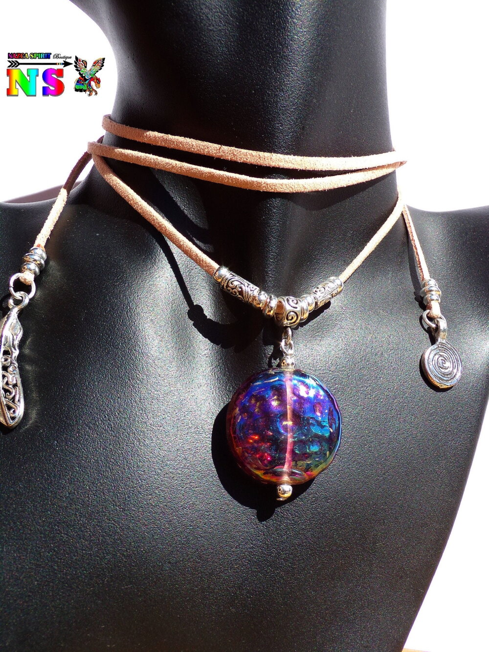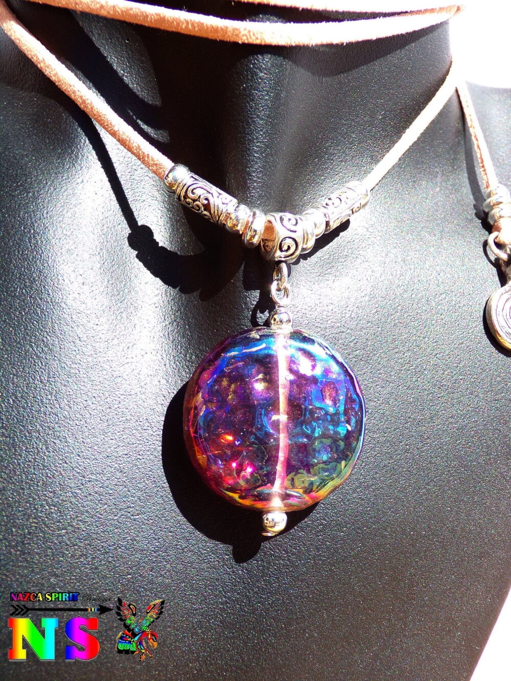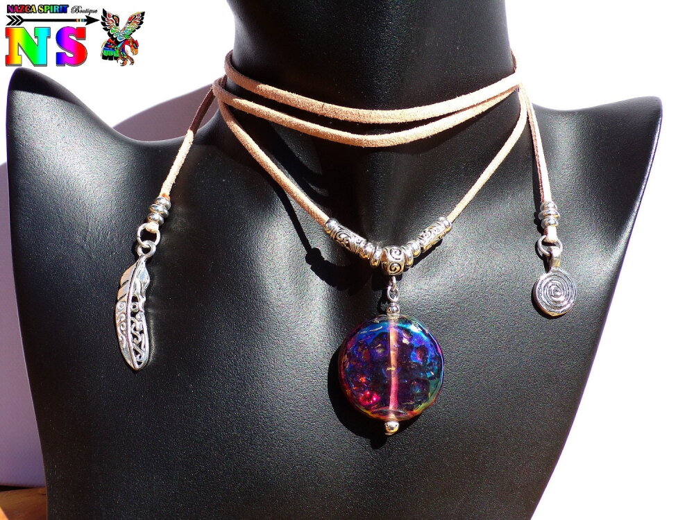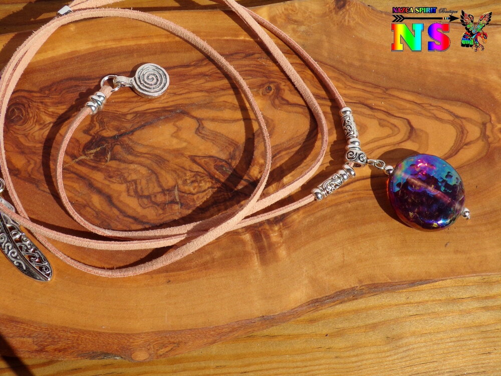Les couleurs du pendentif varient du prune aux couleurs doré cuivré transparent avec de superbes reflets iridescents prune, bleu et doré.