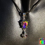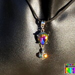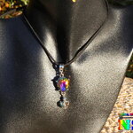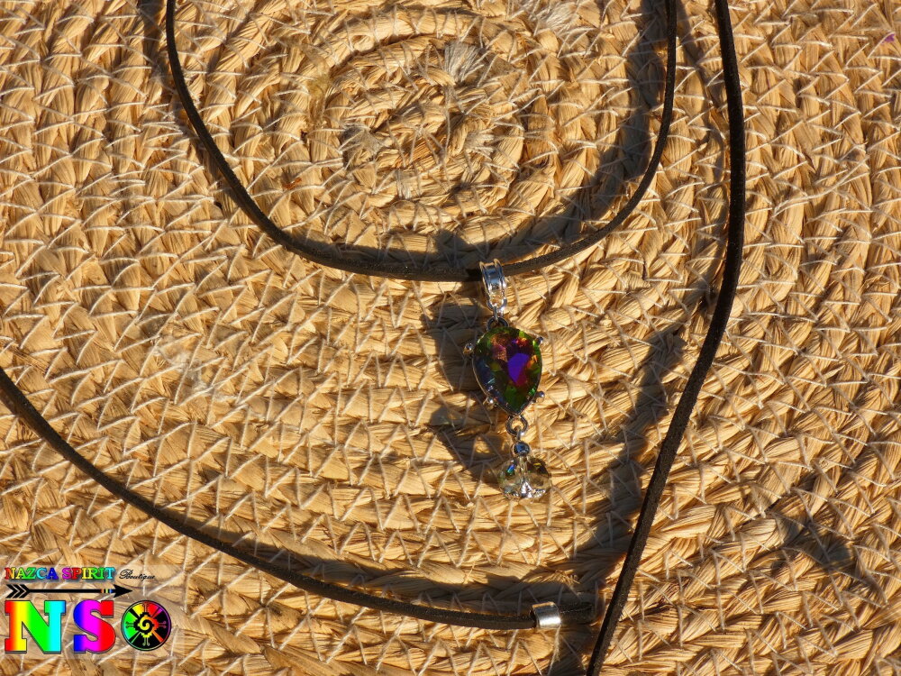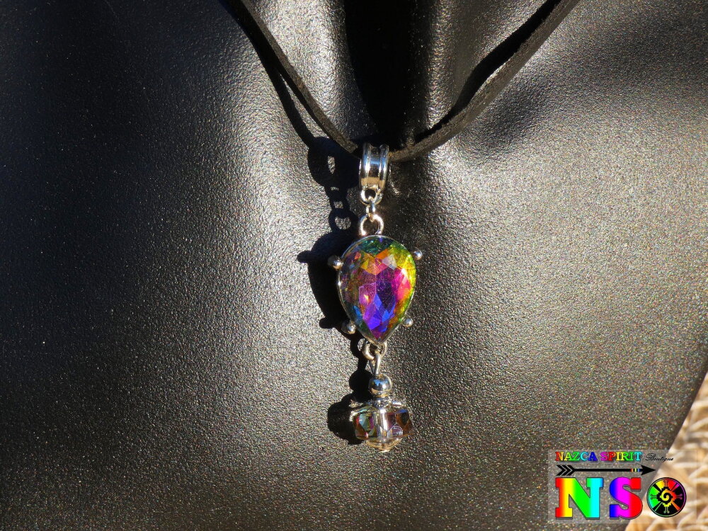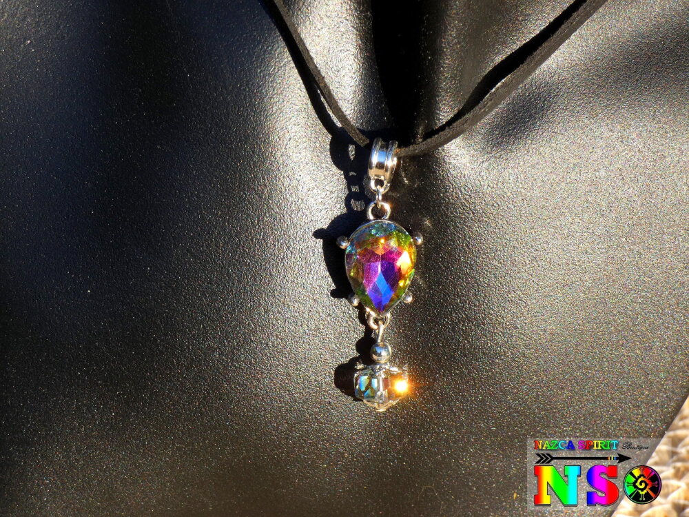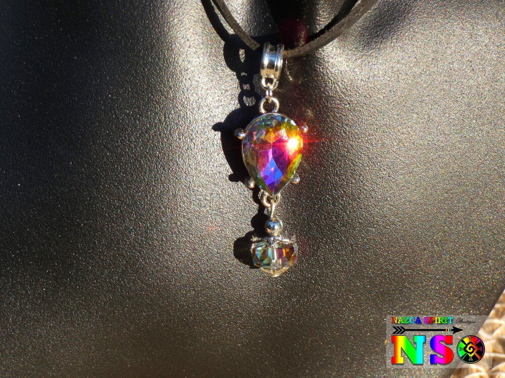 J'ai ensuite réalisé le pendentif à partir d'une jolie bélière design en cuivre plaqué argent à laquelle j'ai relié une monture en cuivre plaqué argent sur laquelle j'ai serti, à l'aide de griffes, un magnifique cristal de bohème en forme de goutte facettée originaire de Tchécoslovaquie couleur cristal vitrail iridescent. Au bout de la goutte j'ai relié un 2nd cristal de couleur cristal vitrail iridescent.