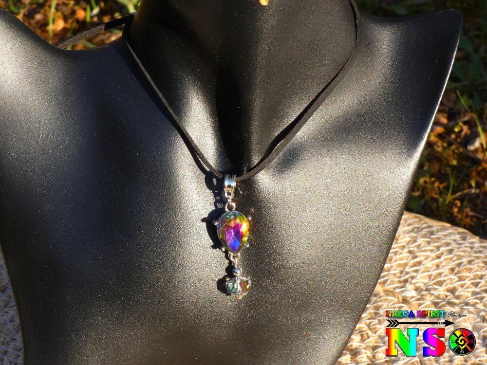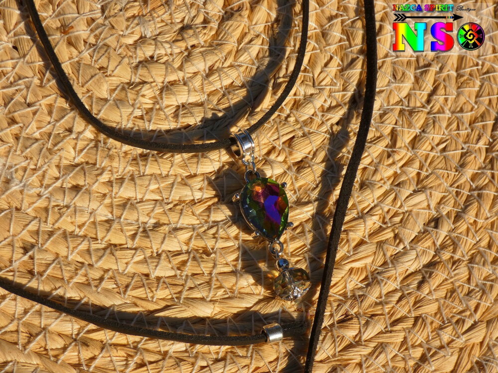 Matériaux : cristal de bohème (Origine : Tchécoslovaquie), daim suédé effet finition cuir, monture en cuivre plaqué argent (Origine : Tchécoslovaquie), alliage tibétain, alliage tibétain.