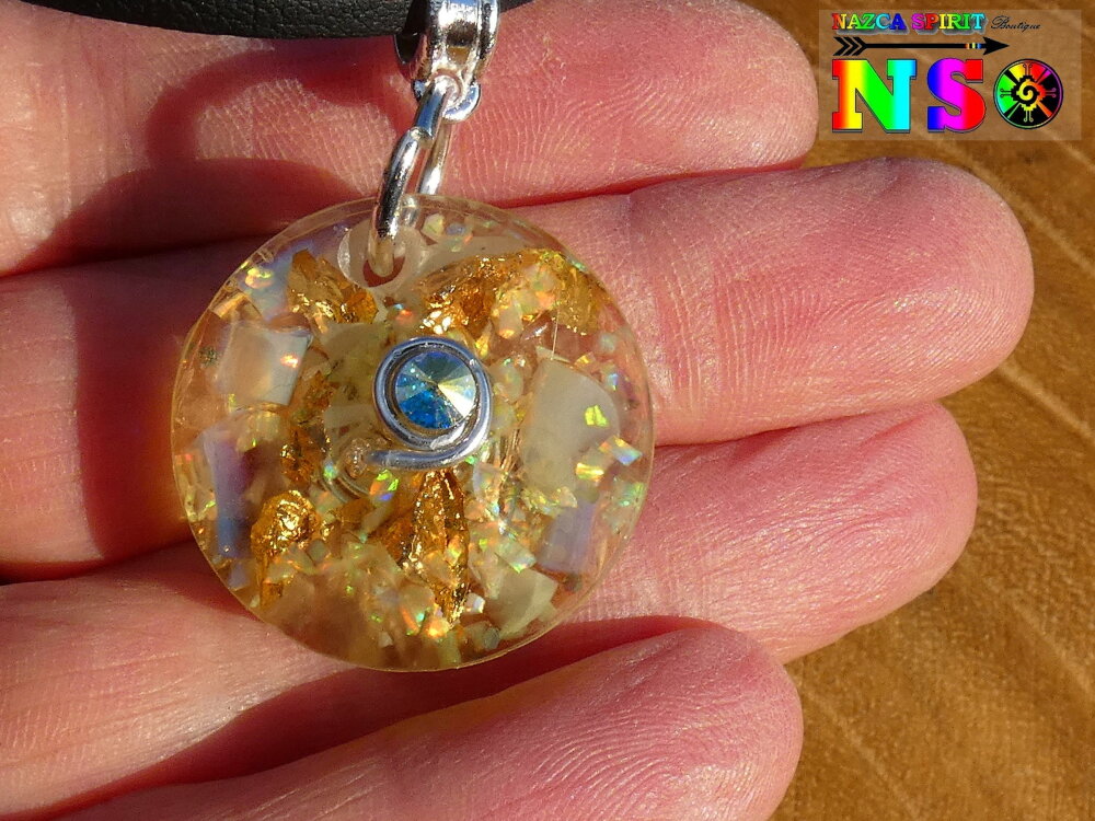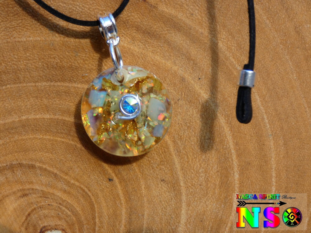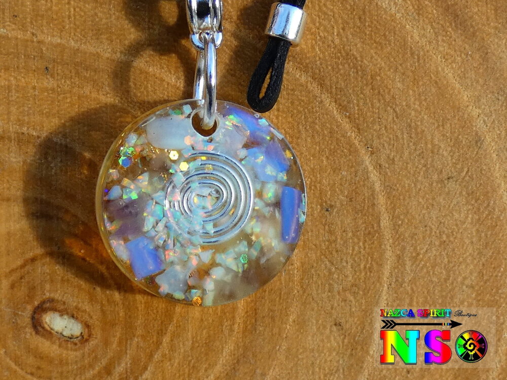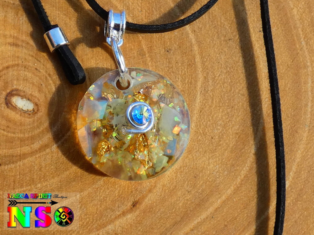 Je vous propose de découvrir un collier ajustable équipé d'un pendentif rond de 4 cm ("1.57) de long x 2.5 cm ("0.98) de diamètre en orgonite intégralement réalisé à la main à partir de résine cristal, de fil de cuivre plaqué argent, de pierres fines naturelles (cristal de roche, améthystes), de cristaux d'opales de feu welo Ethiopie, de morceaux d'opales du Pérou Vert opale, de morceaux d'opalines, de feuilles d'or 18K et de poudre luminescentes.