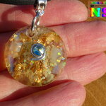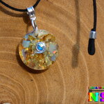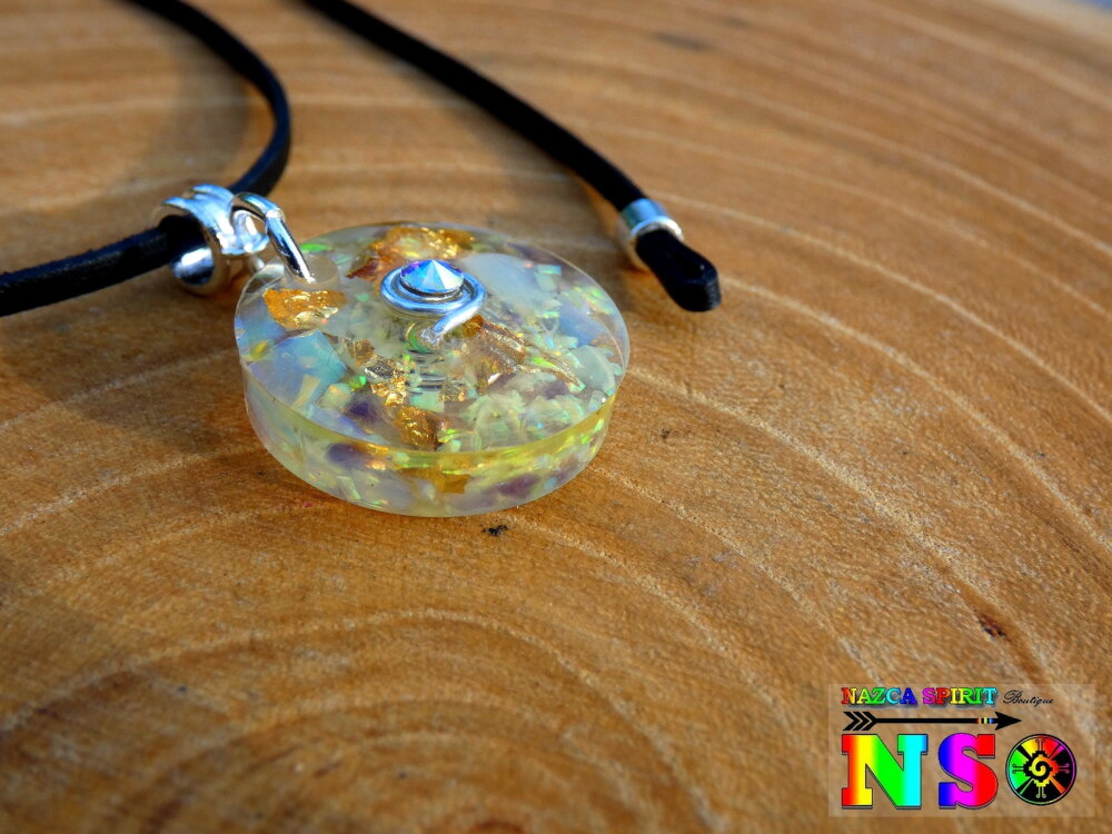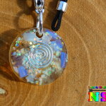 Le disque d'orgonite a été relié à une jolie bélière en cuivre plaqué argent. Durant la réalisation de ce pendentif j'ai inséré, par couches successives, une image holographique représentant une plume amérindienne, des particules holographiques ultra iridescentes, de la feuille d'or 18K et une nouveauté... de la poudre luminescente dont la particularité est de briller dans la pénombre ou le noir total.