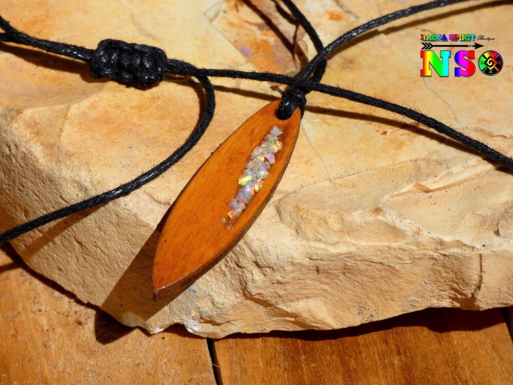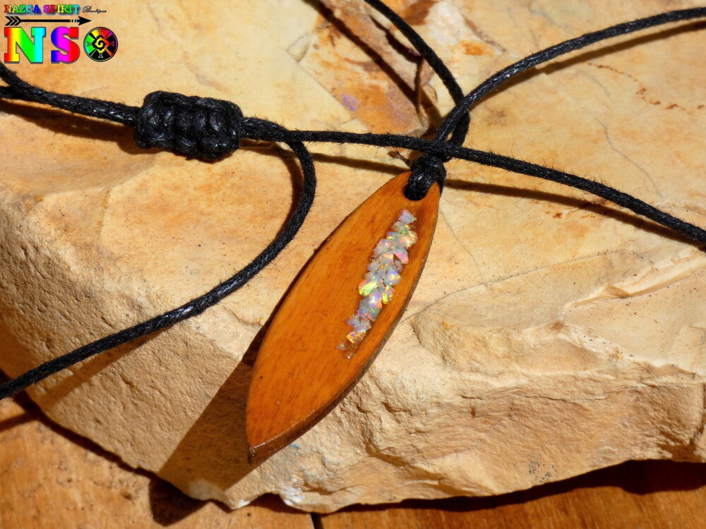 Collier Ajustable Pendentif Mini Surf en Bois d'Eucalyptus et Opales de Feu - Thème Australie - Bijou Océan Fait Main Multicolore Iridescent