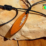 Au bout du tour de cou j'ai relié un pendentif en forme de planche de surf australien découpé dans du bois d'Eucalyptus qui provient de chez moi (nous possédons deux grands eucalyptus dans notre jardin). Le surf a été ensuite poli, puis teinté à l'aide de pigments naturels couleur havane qui est produit dans le Vaucluse en Provence où mon atelier est situé depuis 2013.