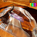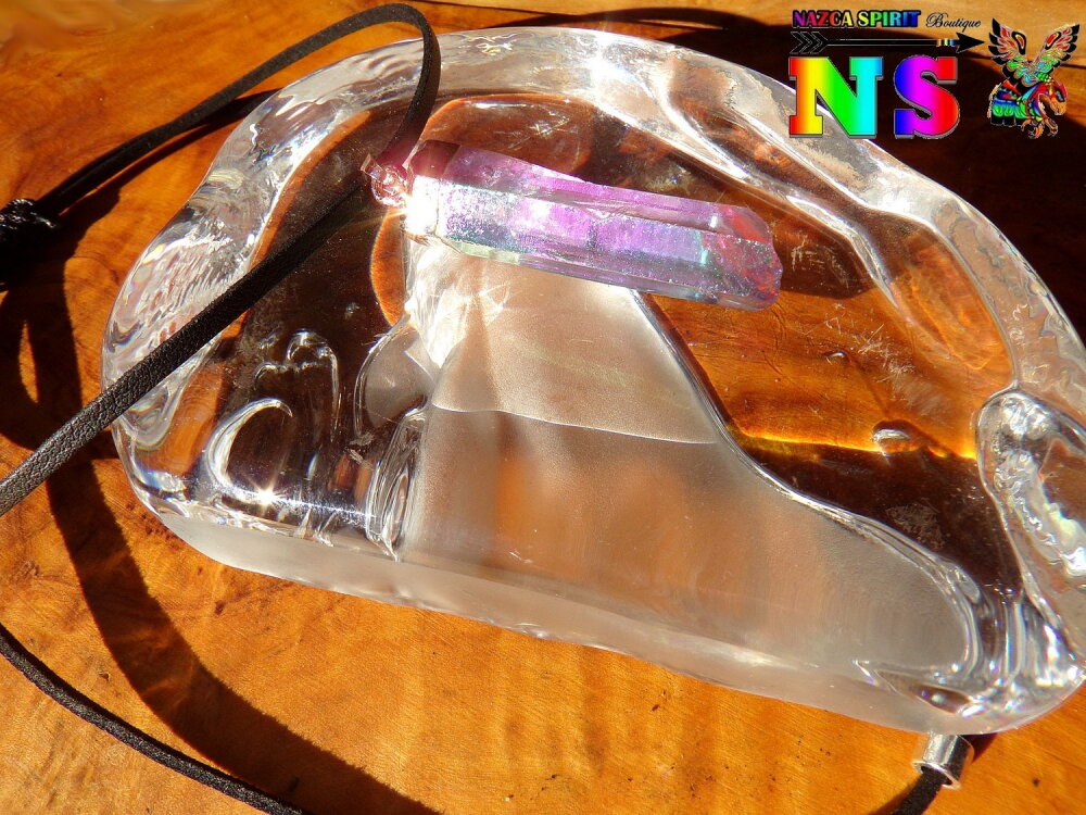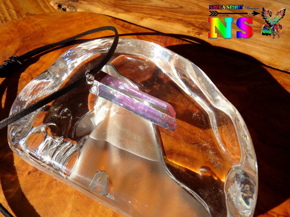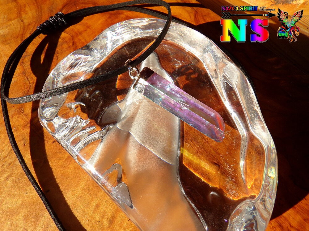 Je vous présente un superbe collier réglable d'inspiration bohème ethnique réalisé à partir d'un lacet de suédine noir effet cuir sur lequel j'ai relié une pointe de cristal de roche quartz couleur améthyste iridescent AB. La pointe de cristal est recouverte sur son sommet d'une fine couche de laiton argenté.