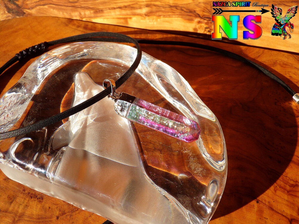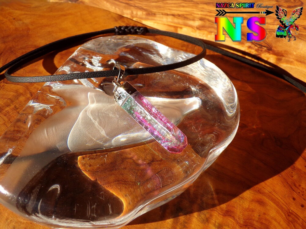 Collier Ajustable Pendentif Pointe Cristal de Roche Quartz / Bijou Bohème-Ethnique / Pendentif Cristal Naturel / Couleur Améthyste AB