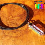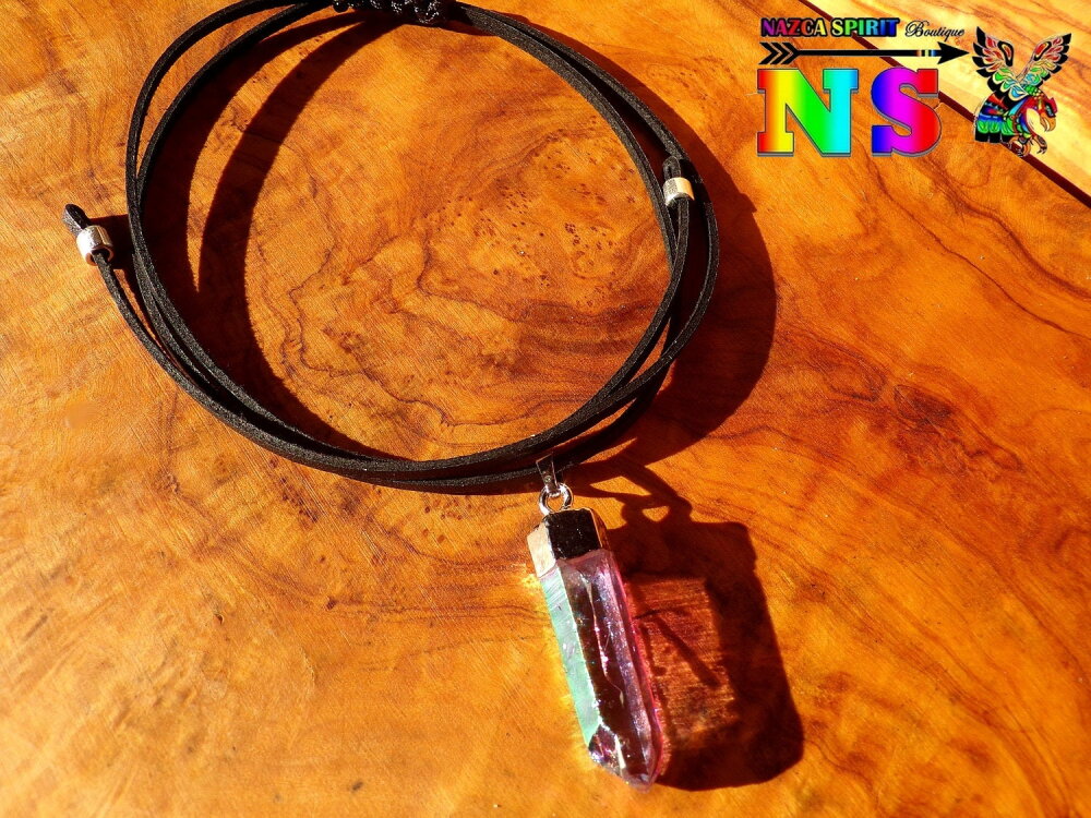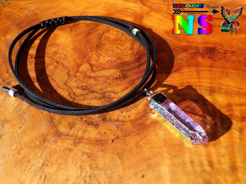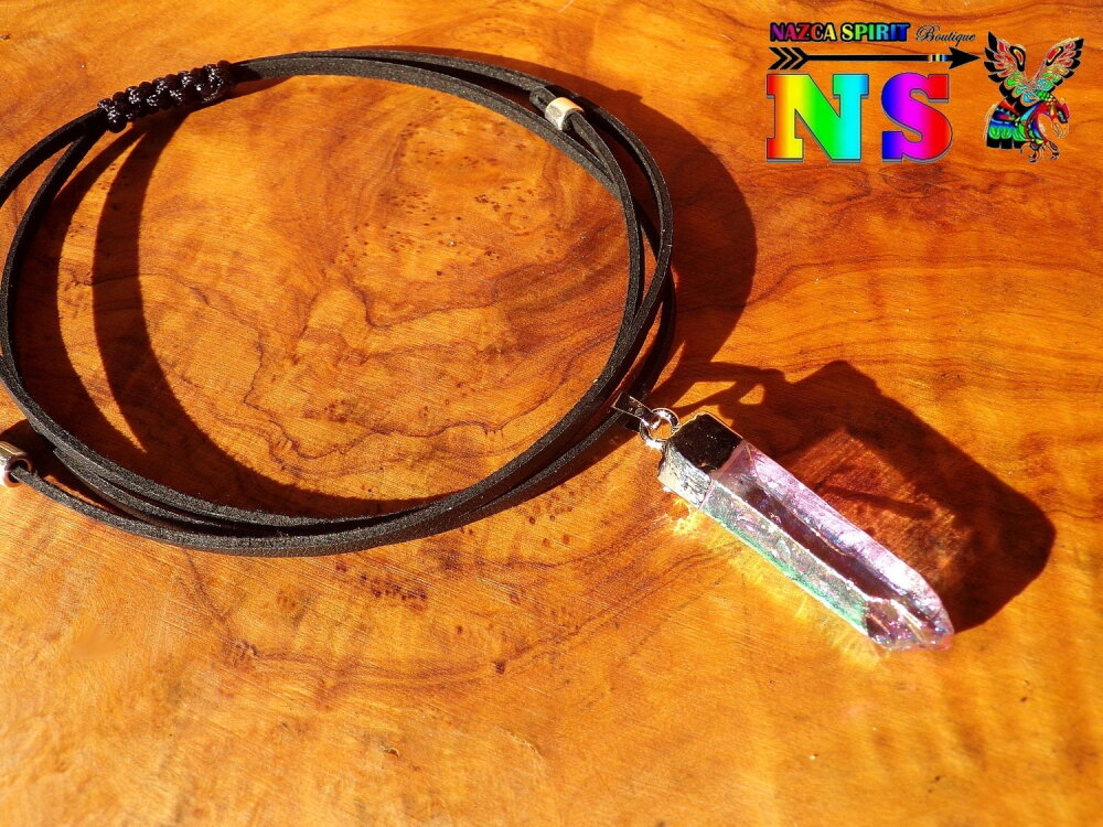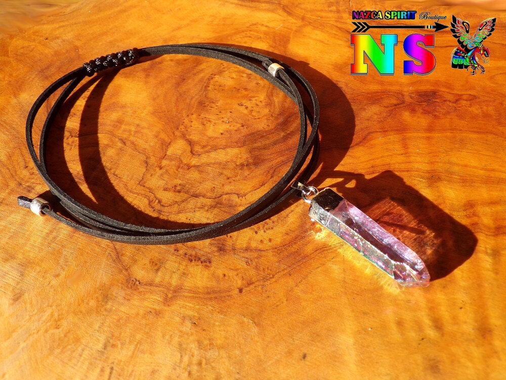 Je vous présente un superbe collier réglable d'inspiration bohème ethnique réalisé à partir d'un lacet de suédine noir effet cuir sur lequel j'ai relié une pointe de cristal de roche quartz couleur améthyste iridescent AB. La pointe de cristal est recouverte sur son sommet d'une fine couche de laiton argenté.