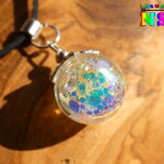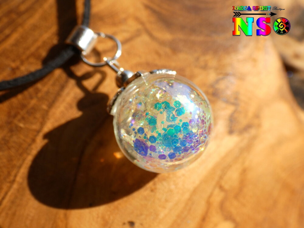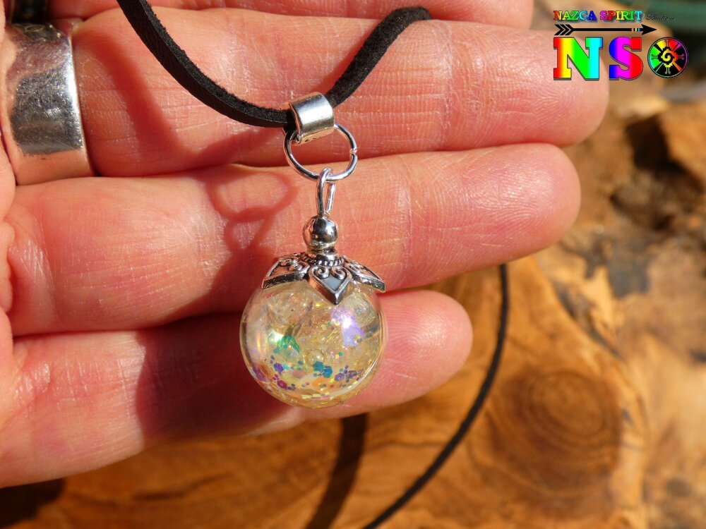 Je vous propose de découvrir un superbe bijou magique entièrement réalisé à la main. Le pendentif est une boule en verre de 2 cm de diamètre qui a été travaillée à l'aide de résine et de particules Ultra iridescentes. Un bijou féérique unique super lumineux suspendu à un tour de cou ajustable de 80 cm de long qui s'ajuste à votre tour de cou grâce à un système coulissant ingénieux . Le sommet du pendentif a été réalisé à partir d'une coupelle ciselée en alliage tibétain plaqué argent que j'ai fait fusionner avec la résine sur le sommet de la boule en verre afin que la coupelle ne se détache jamais.