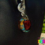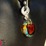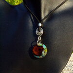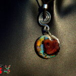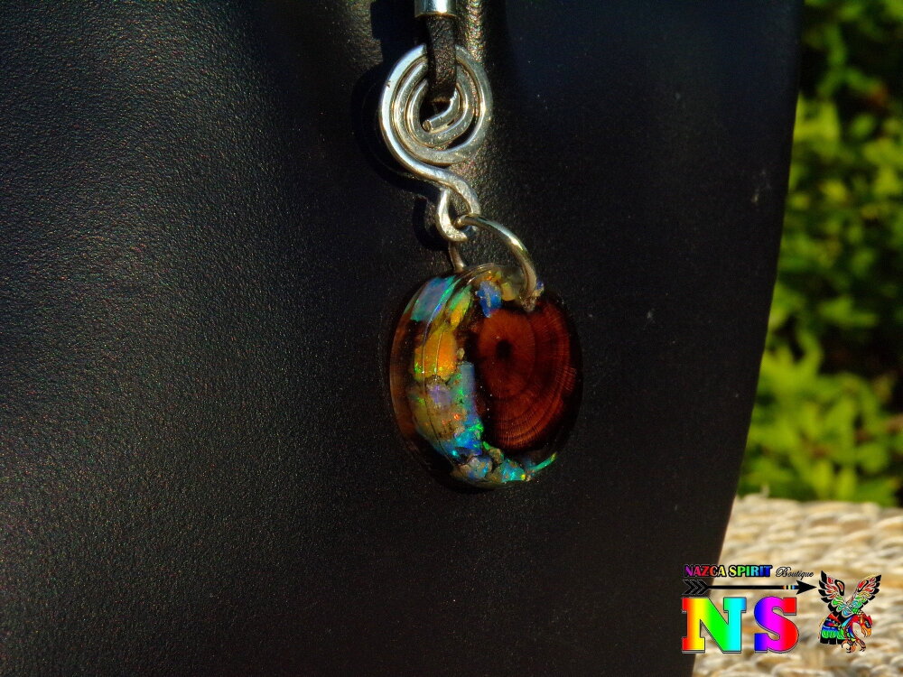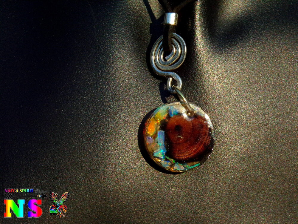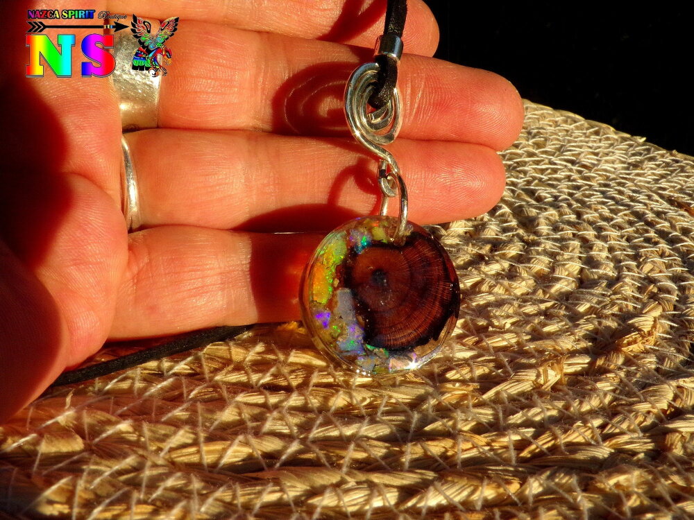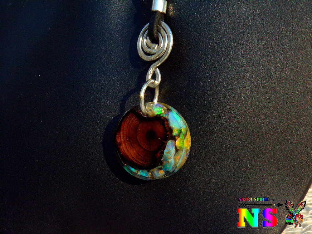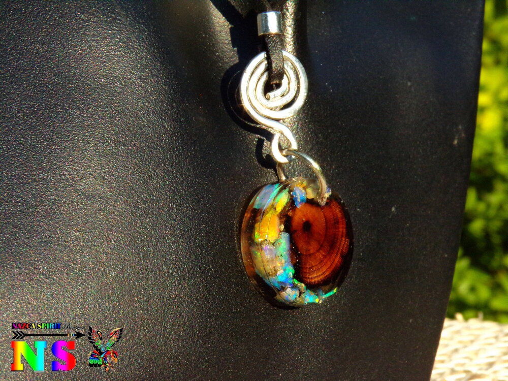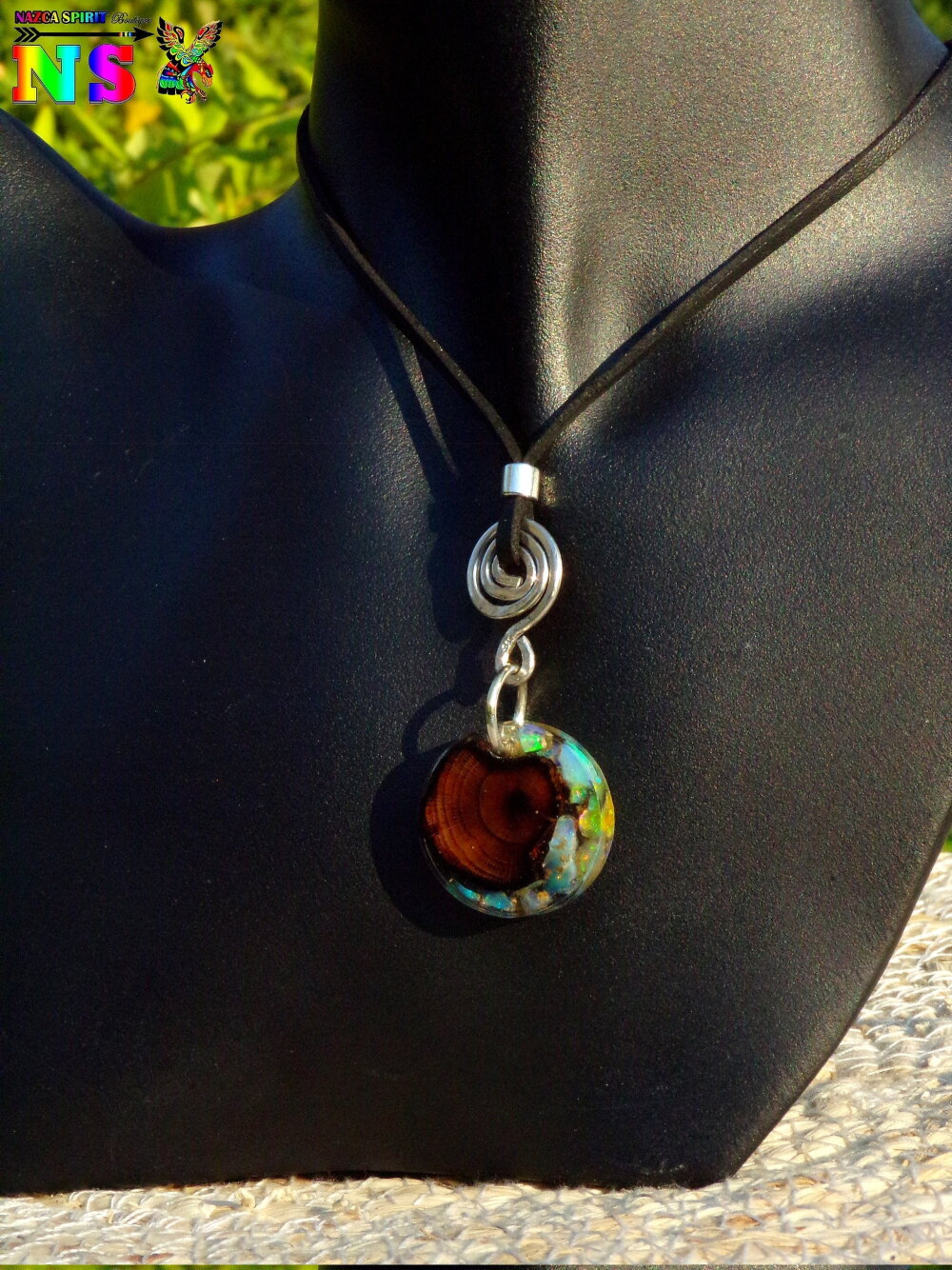 Le pendentif a été réalisé à partir de bois d'eucalyptus, de morceaux d'opales multicolore iridescentes fusionnées dans de la résine cristal. Pour la création de la bélière en forme de spirale, j'ai façonné un fil d'argent sterling de 2 mm de diamètre martelé à la main.