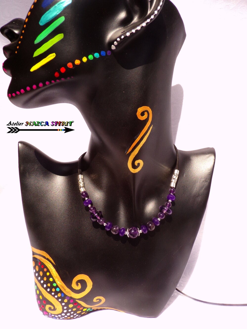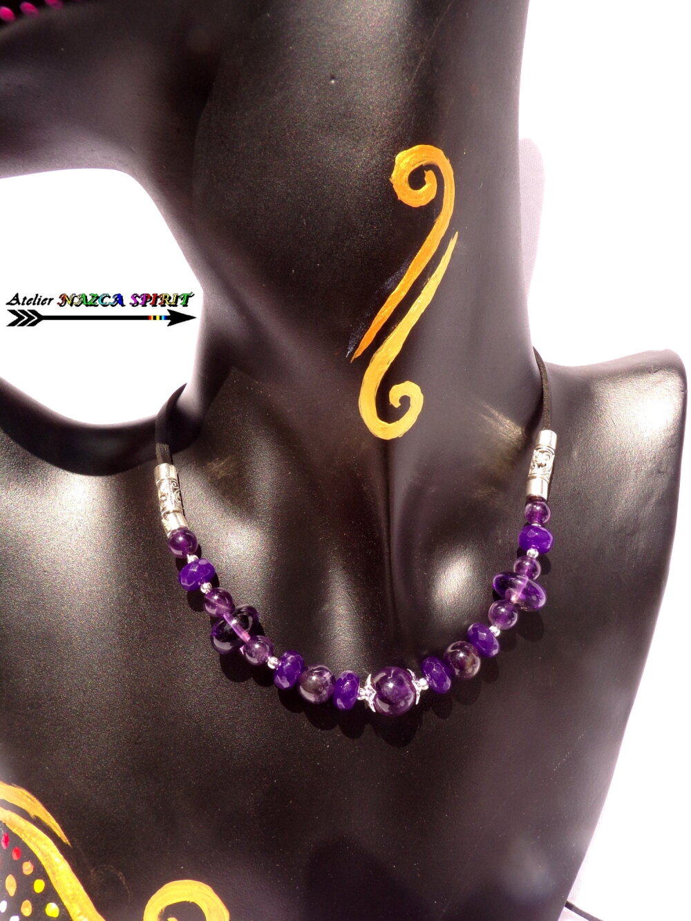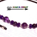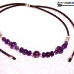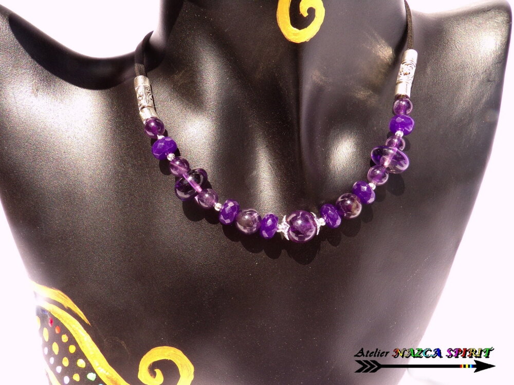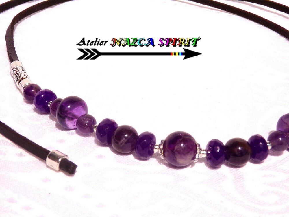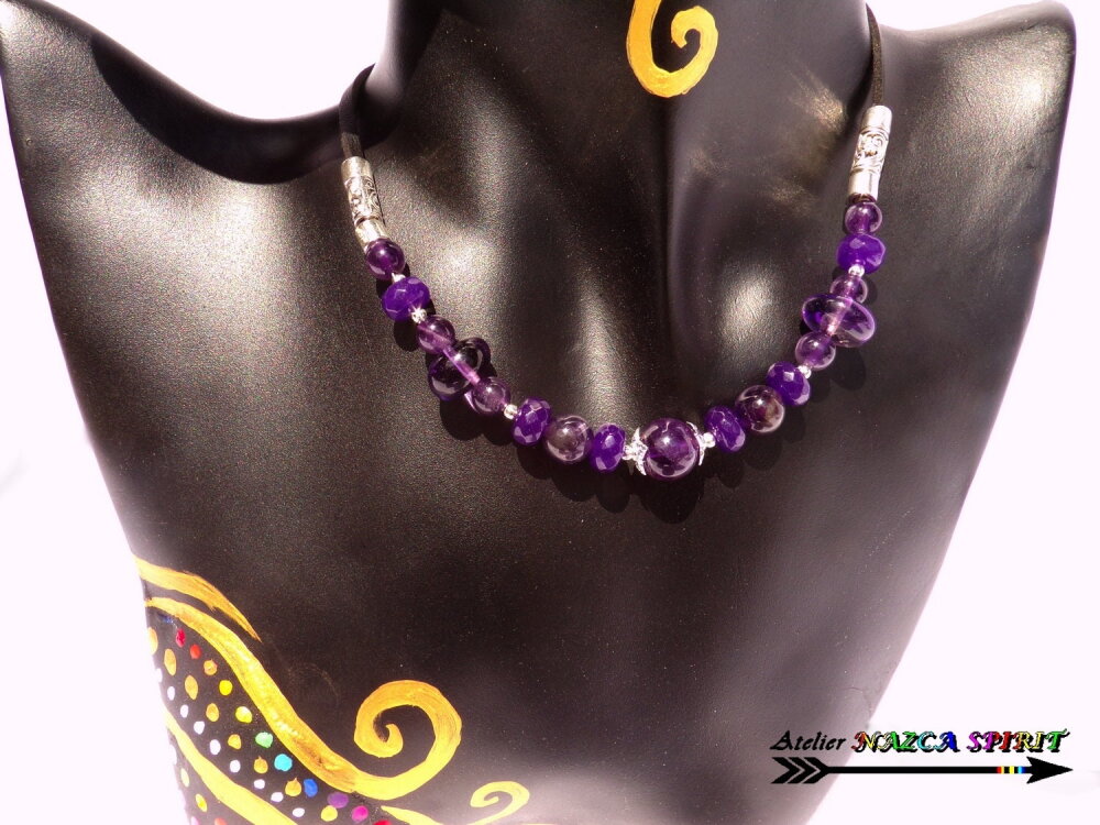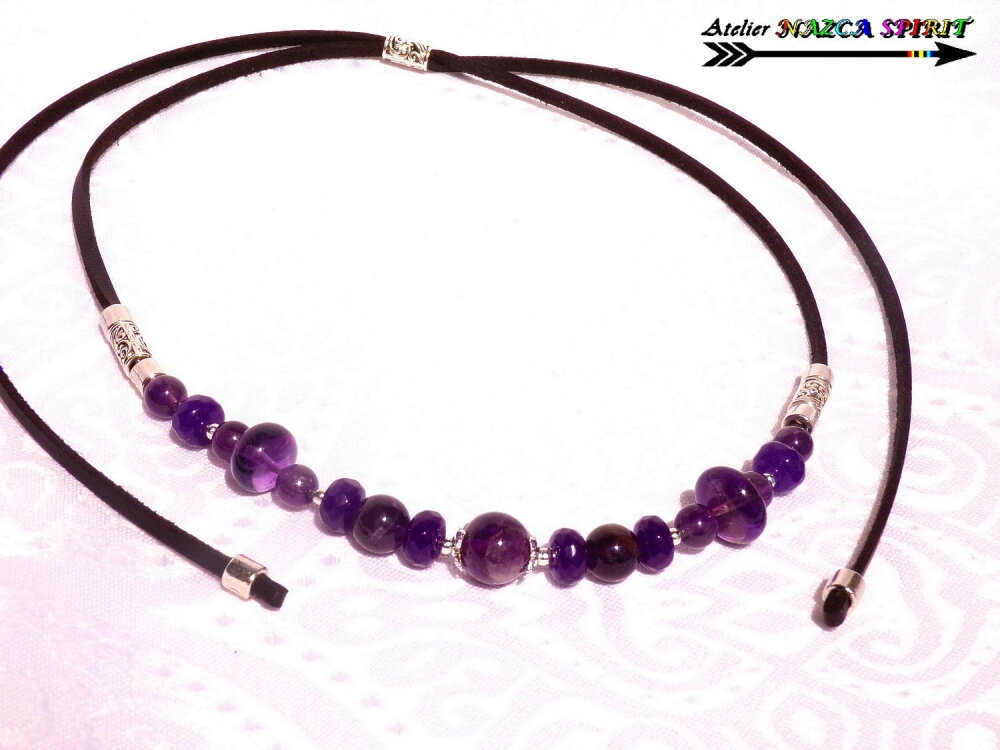 Matériaux : cuivre plaqué argent, suédine noire effet cuir, améthystes naturelles, alliage tibétain