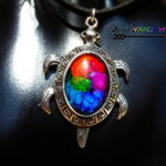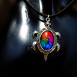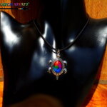 J'ai réalisé ce collier porte bonheur d'inspiration ethnique à partir de lacet suédine noir effet cuir, d'un pendentif en alliage tibétain plaqué argent représentant une adorable tortue australienne parée de jolies gravures ethniques sur laquelle j'ai fixé un cabochon ovale en verre que j'ai coloré à l'aide d'une technique de coloration que j'ai inventée et fait breveter auprès de l'INPI en 2013.