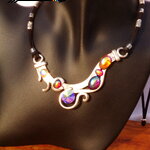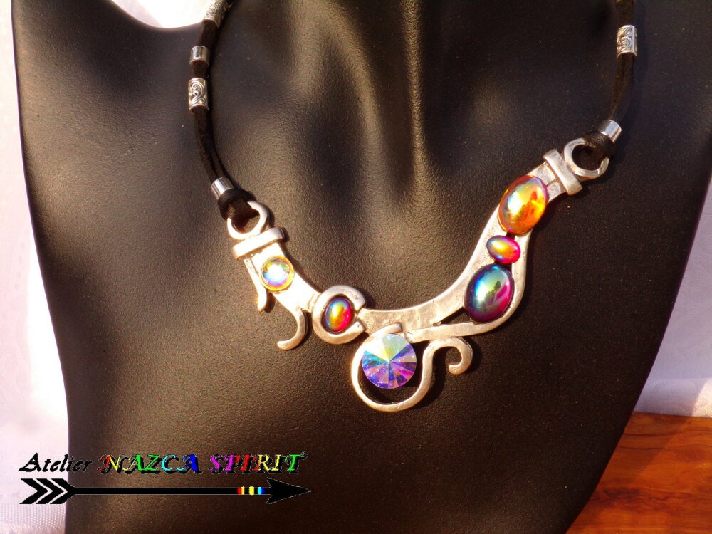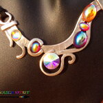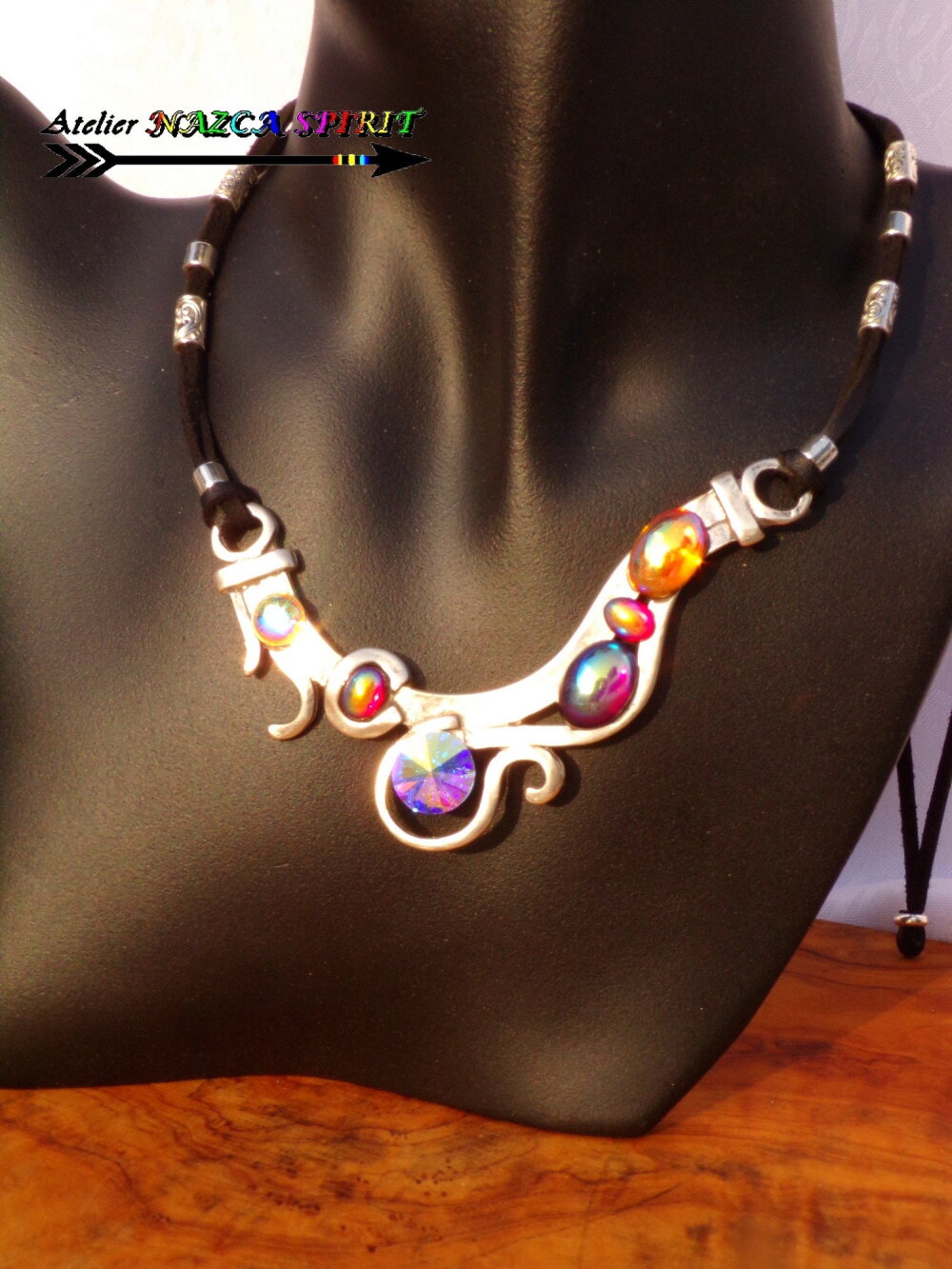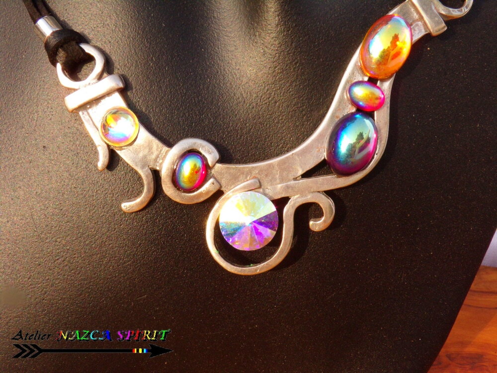 Collier fait main à partir d'un connecteur très original en fer forgé ouvragé à l'esprit très design sur lequel j'ai fixé 1 cabochon rond en cristal autrichien couleur aurore boréale et 4 grands cabochons ovales en cristal autrichien iridescents couleurs volcano, rouge siam iridescent, cognac iridescent.