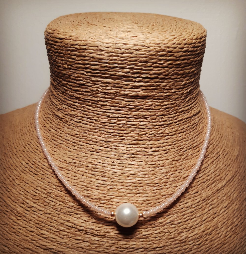 Collier en perles de rocailles Miyuki saumon avec perles en verre blanche. Fermoir à ressort en acier inoxydable.