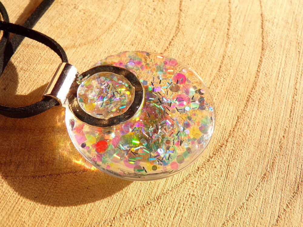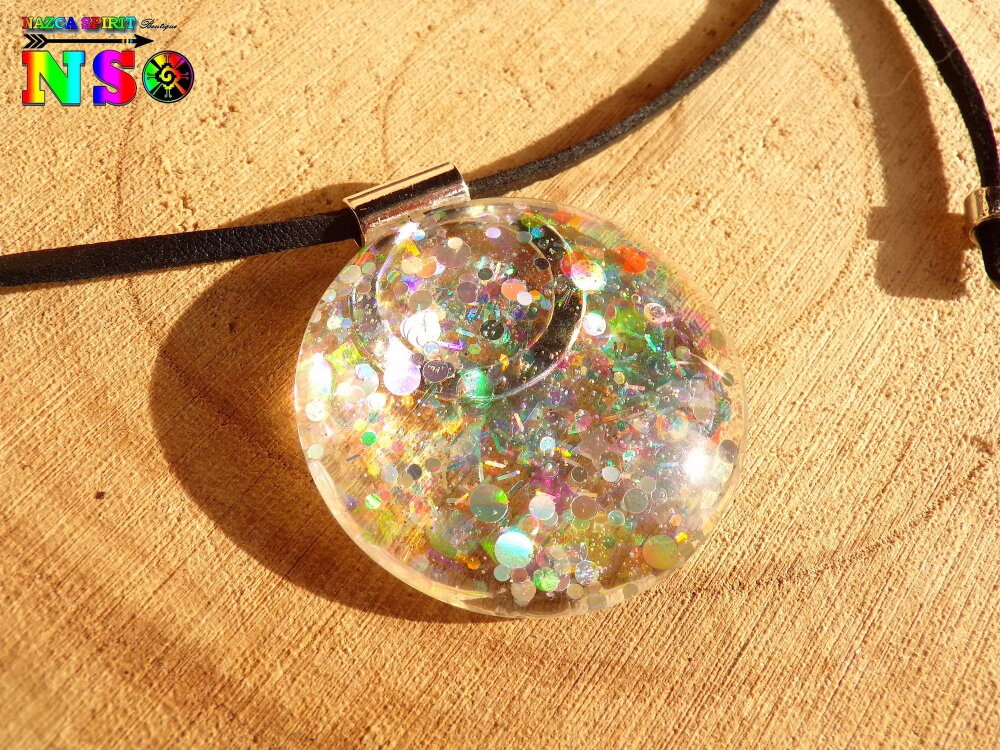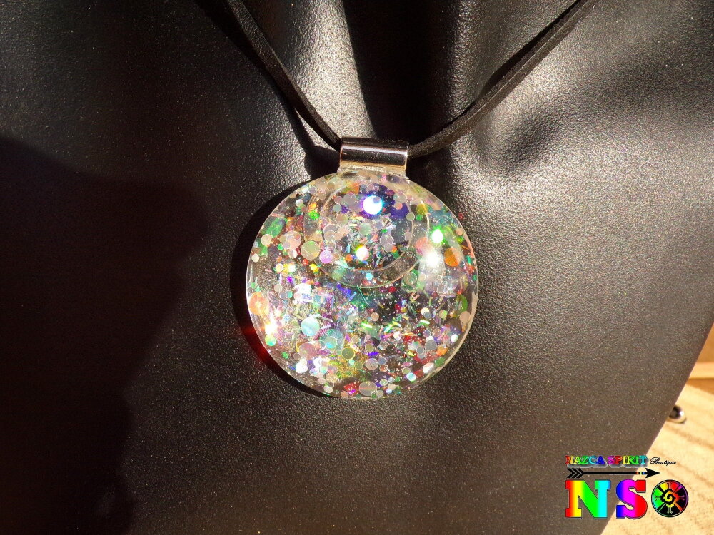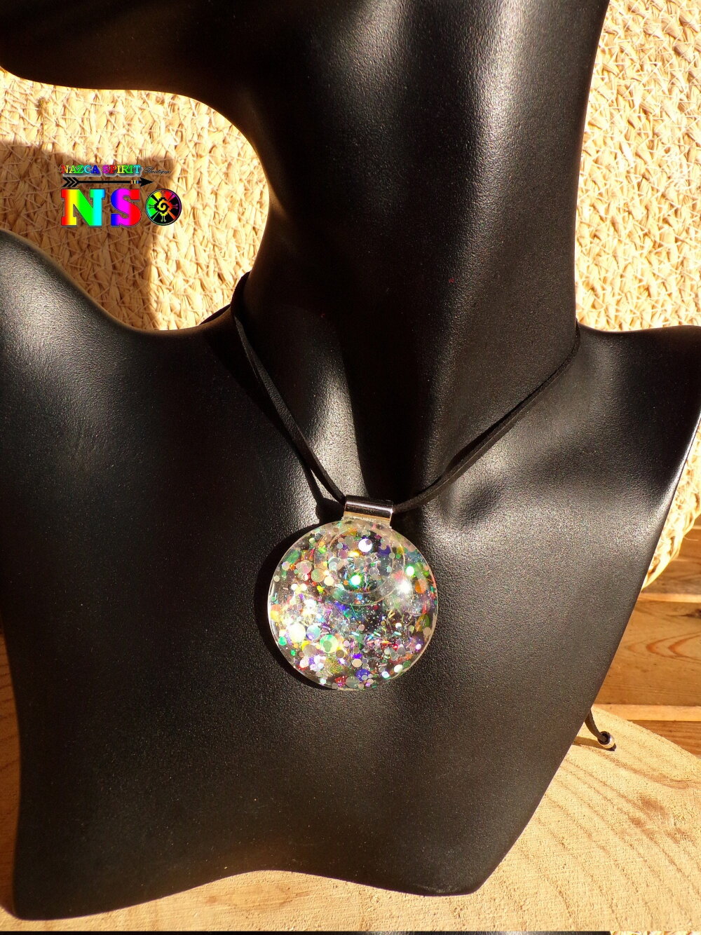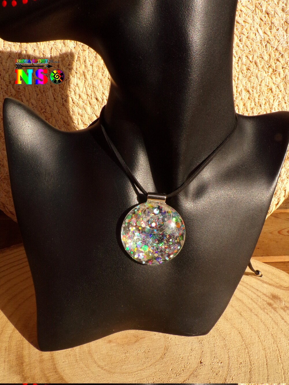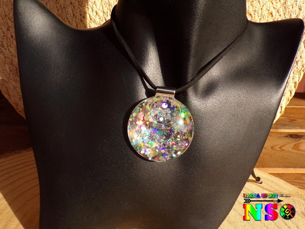 Je vous propose de découvrir un collier bohème hippie intégralement réalisé à la main. Le collier est ajustable, il est équipé d'un tour de cou en daim suédé effet cuir qui se serre et se desserre à l'aide d'un système coulissant réalisé à partir d'un lacet en daim suédé noir effet finition cuir. Au bout du tour de cou j'ai relié un pendentif que j'ai réalisé à partir d'un cabochon rond en verre effet loupe de 4 cm de diamètre, d'une bélière en alliage tibétain plaqué argent représentant un cercle design martelé, de particules holographiques et de résine cristal de finition.