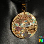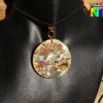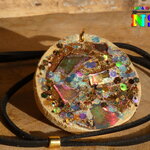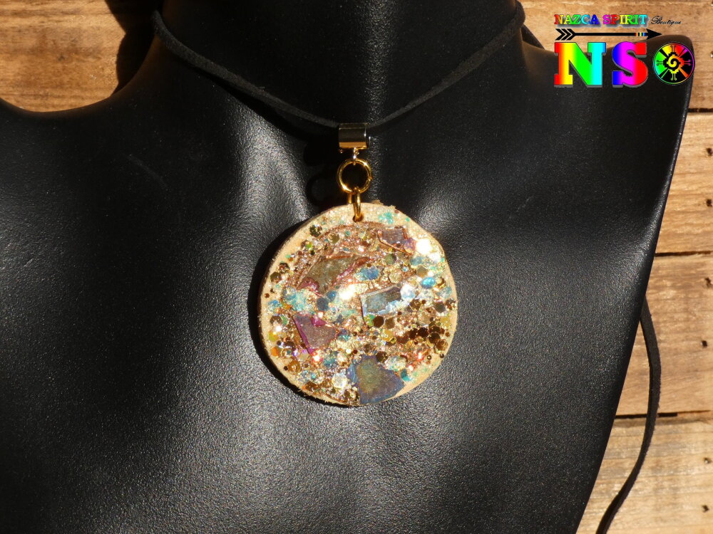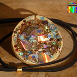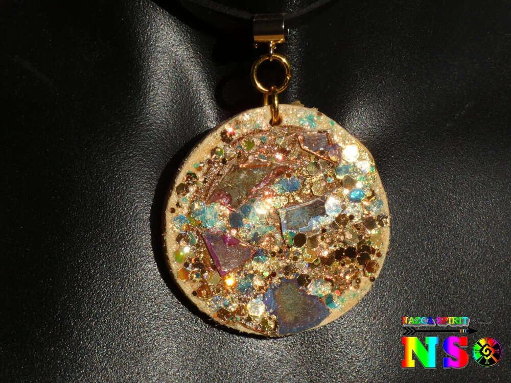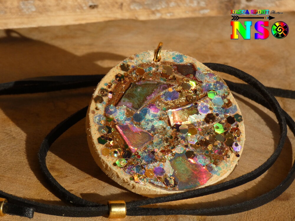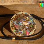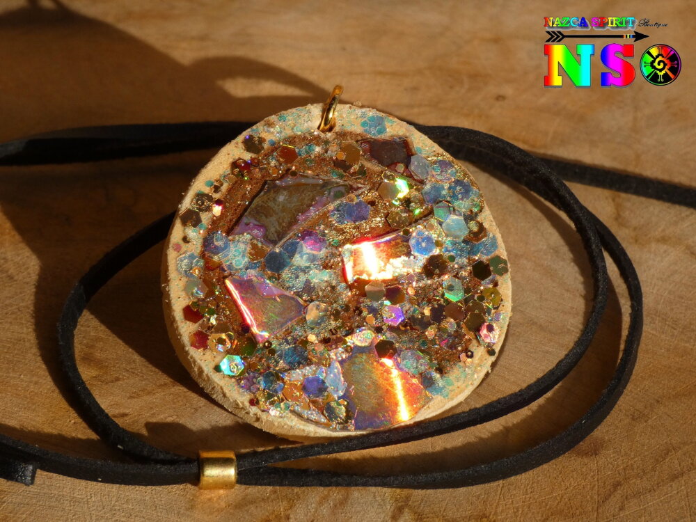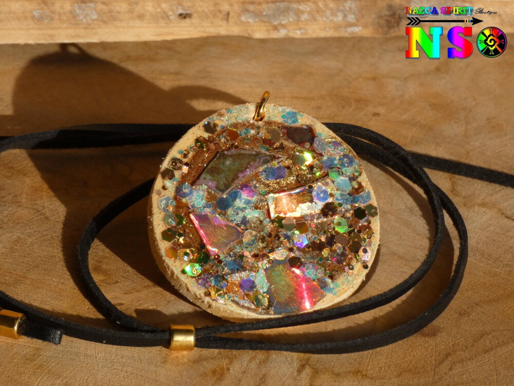 Pour réaliser ce collier j'ai utilisé une rondelle en bois d'acacia, de la feuille d'or, des morceaux de DVD et CD recyclé, des paillettes holographiques multicolores à la fois iridescentes et avec des effets laser. Le tout a été fixé à l'aide de résine cristal. Le pendentif est relié au tour de cou réglable à l'aide d'un anneau et d'une jolie bélière en laiton or.