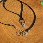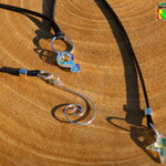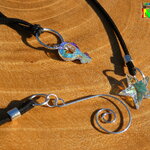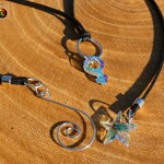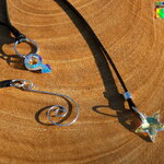 A chaque bout du tour de cou j'ai relié des pendants. Sur le 1er bout j'ai relié une étoile facettée en cristal autrichien couleur aurore boréale et sur le 2nd bout du tour de cou j'ai relié un très joli pendentif spirale en cuivre plaqué argent.