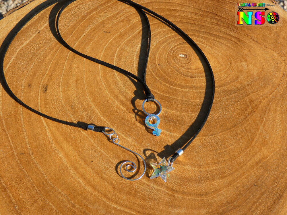 Je vous propose de découvrir un collier ajustable inspiré des bijoux boho bohème. Il s'agit d'un collier réalisé à partir d'un lacet en daim suédé effet finition cuir sur lequel j'ai suspendu à l'aide d'un grand anneau en cuivre plaqué argent, un superbe pendentif en cristal autrichien couleur aurore boréale représentant le symbole féminin.