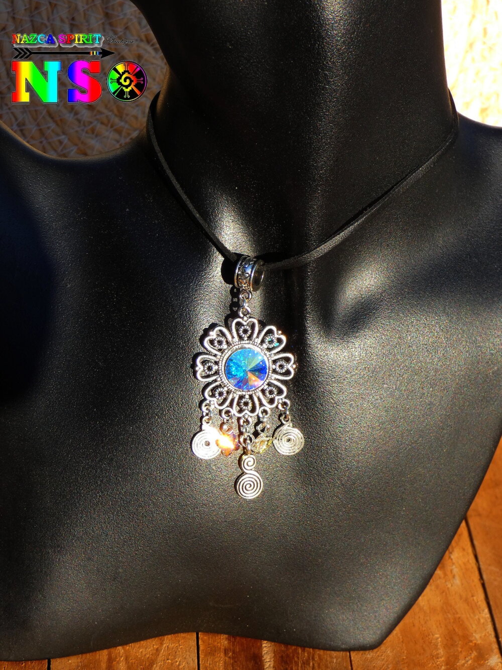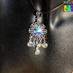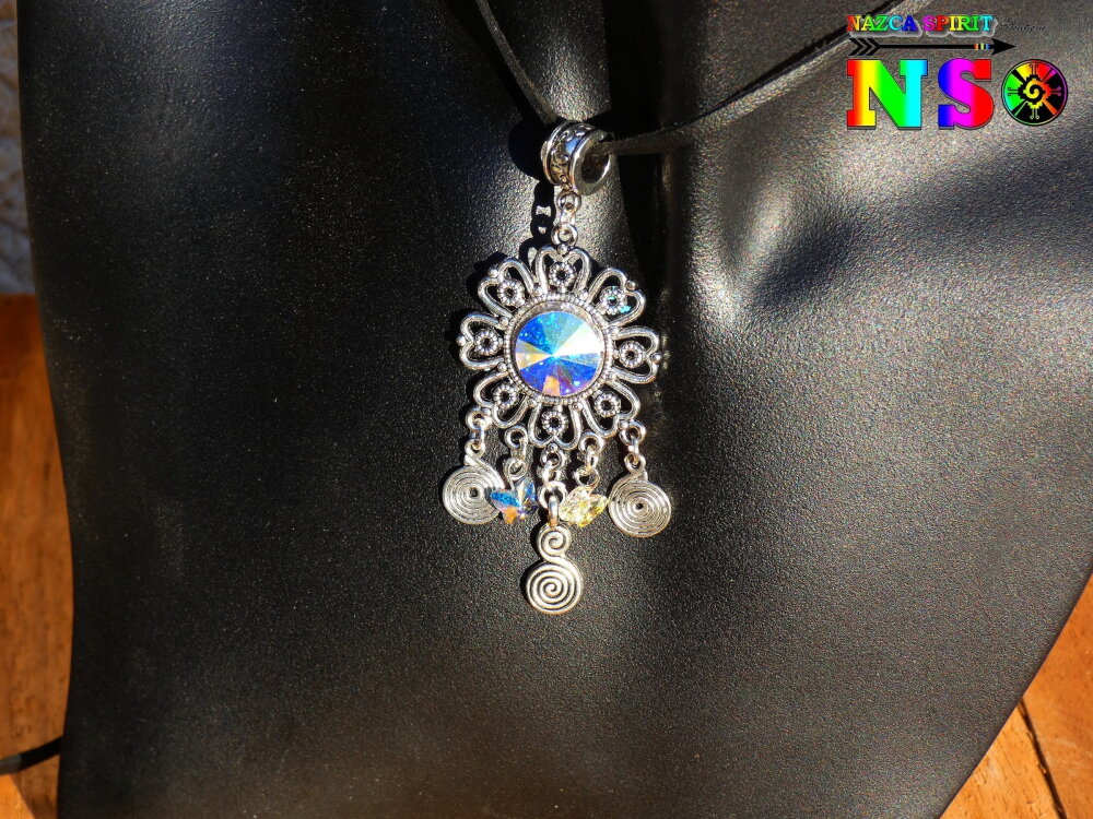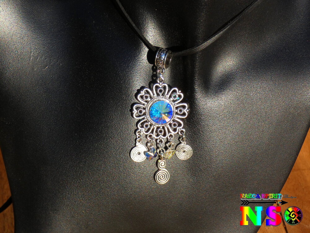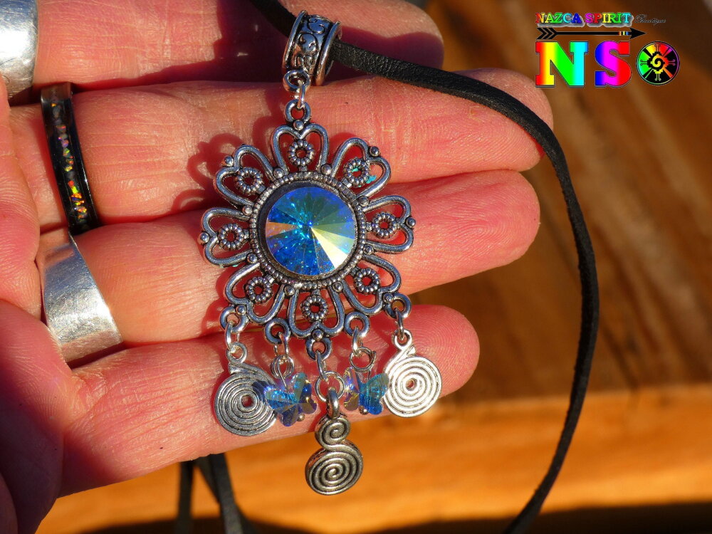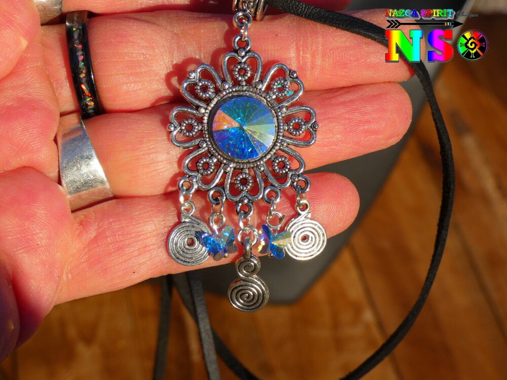 Je vous propose de découvrir un splendide collier bohème ethnique ajustable réalisé à partir d'un lacet en daim suédé effet finition cuir, d'un connecteur en forme de fleur ciselée en laiton plaqué argent, d'un chaton en cristal autrichien facetté et de petites perles forme papillons en cristal autrichien. Le pendentif est relié au tour de cou grâce à une superbe bélière ouvragée gravée en laiton plaqué argent.
