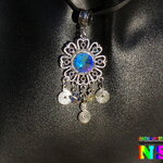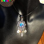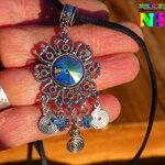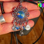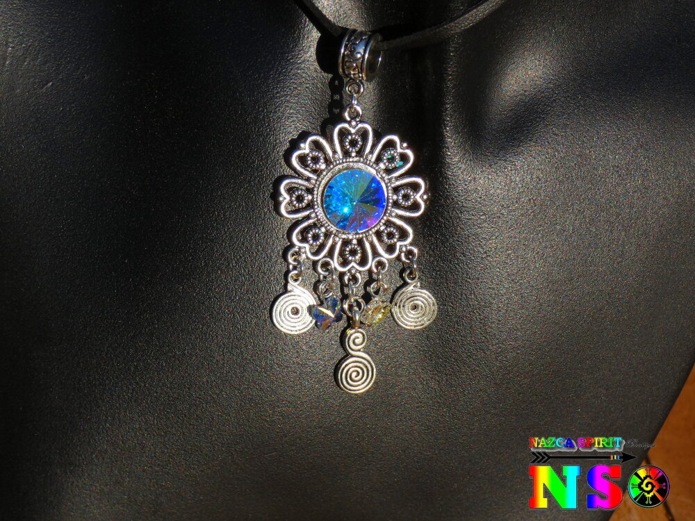 Pour apporter une note précieuse à ce splendide collier bohème, j'ai serti, au centre de la fleur, un chaton en cristal autrichien et j'ai ajouté des petits pendentifs en forme de spirales et des petites perles en forme de petits papillons en cristal autrichien.