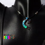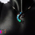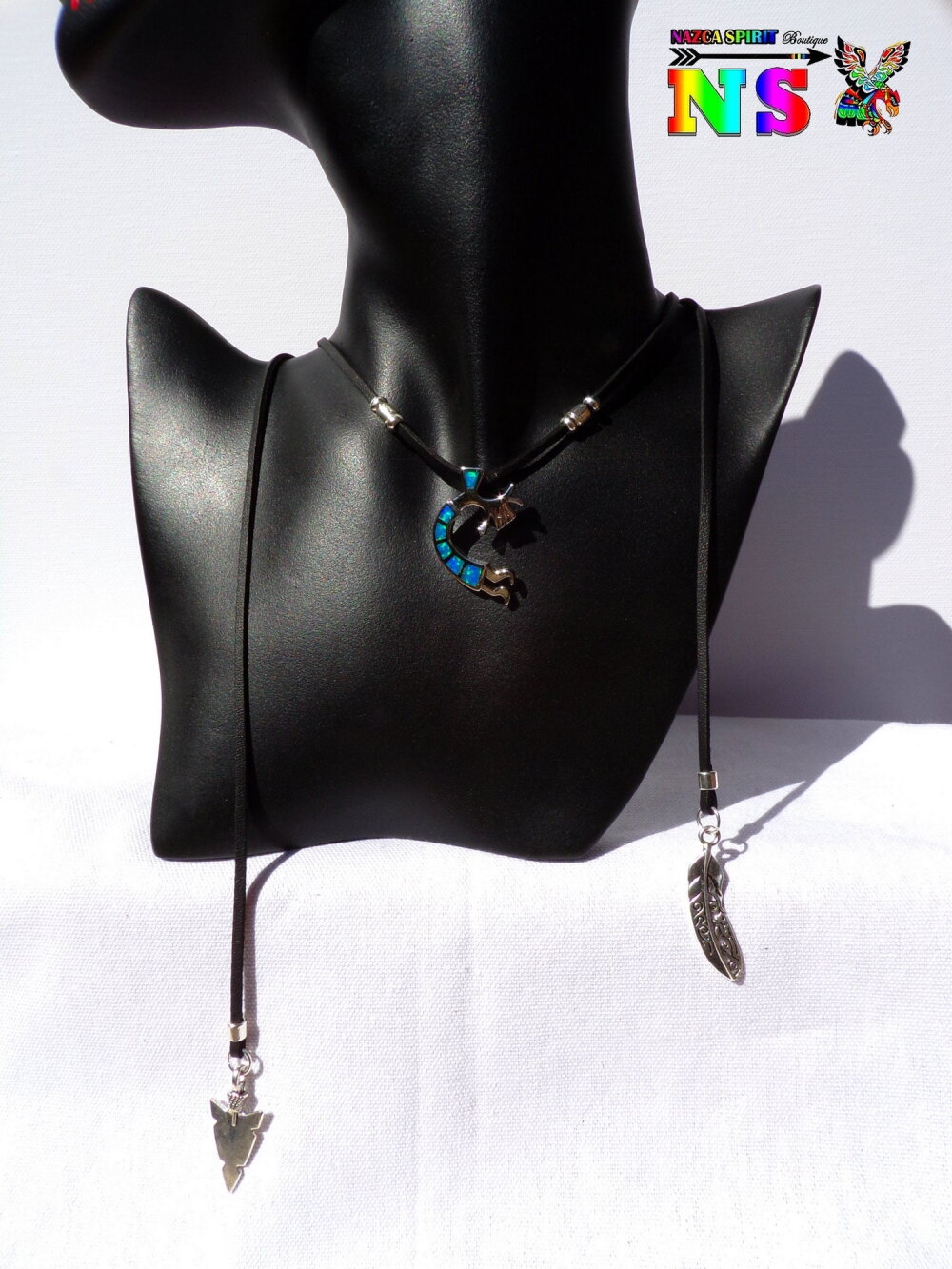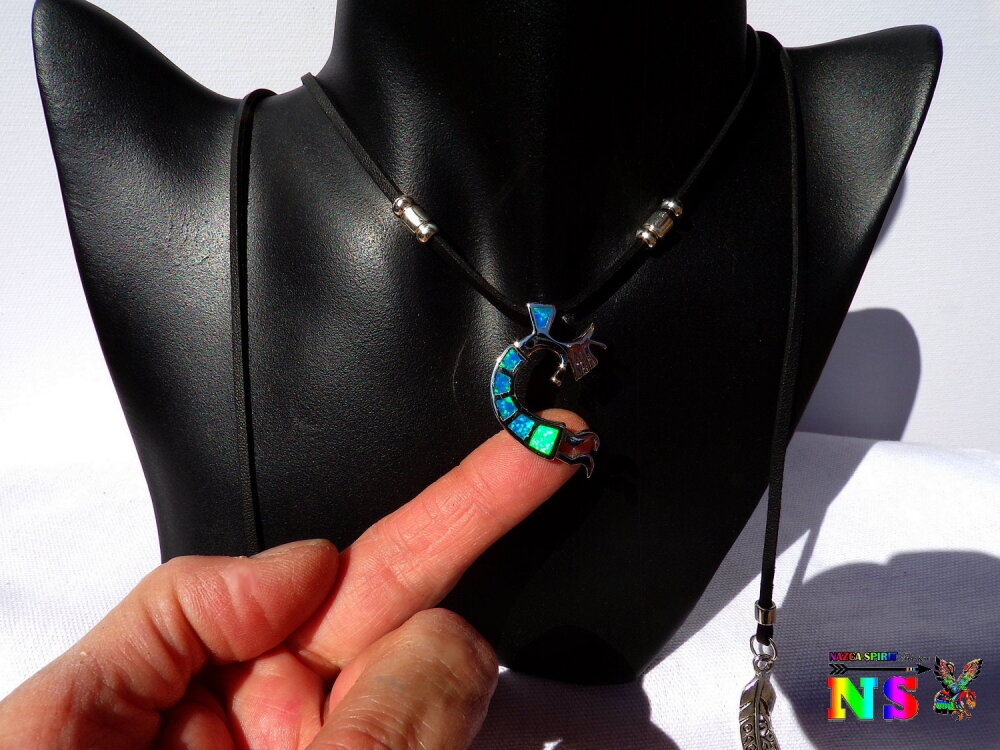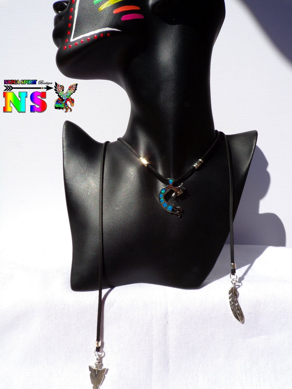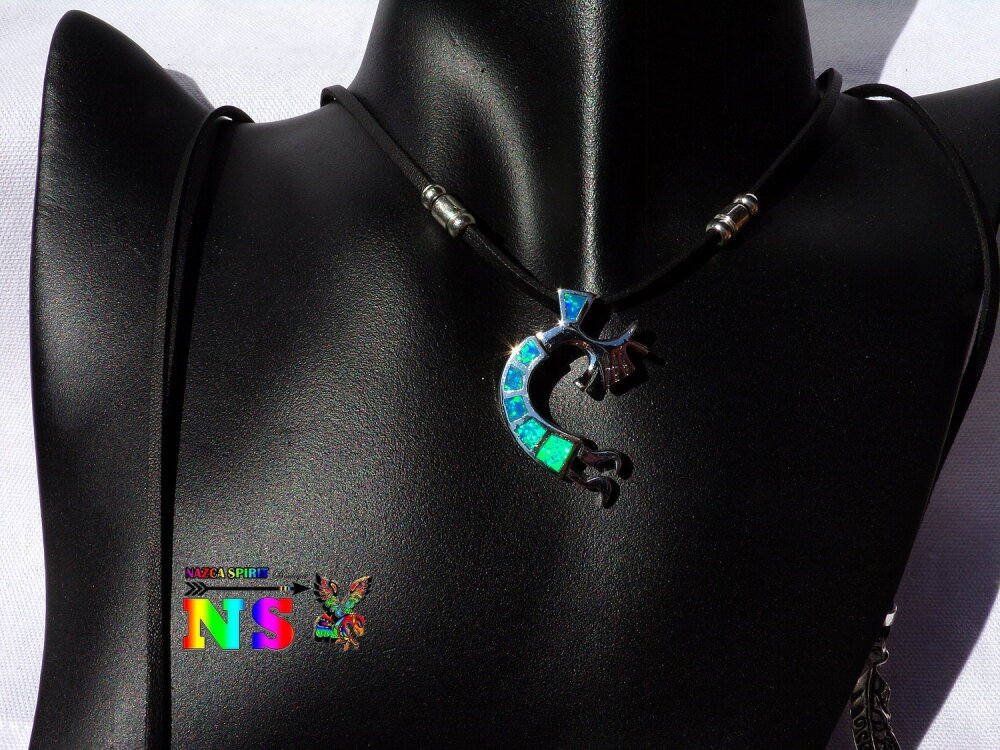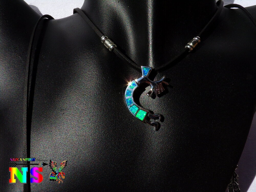 Je vous présente un magnifique collier ajustable tour de cou en simili cuir et son pendentif représentant un superbe Kokopelli en argent sterling avec incrustation d'opales bleues et Bleu Vert .