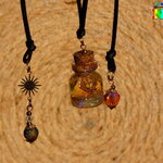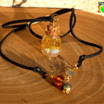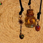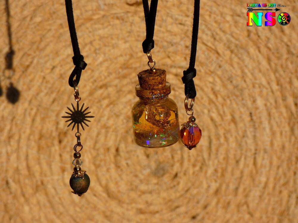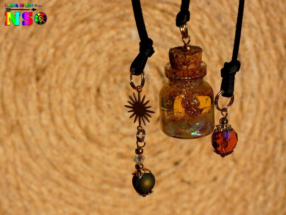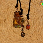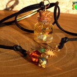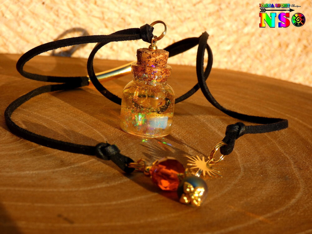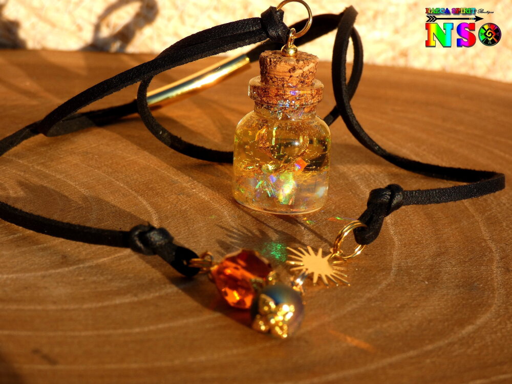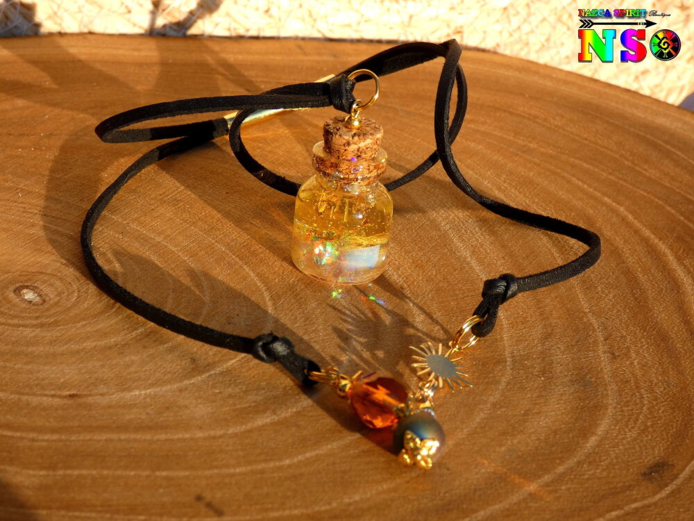 Pour réaliser cette création unique j'ai utilisé un lacet de daim suédé effet finition cuir, un grand flacon en verre équipé d'un bouchon en liège, un grand anneau double en laiton doré utilisé en tant que bélière, une grande perle tube passant en laiton doré pour réaliser le système coulissant du tour de cou, de la résine cristal que j'ai teintée couleur cognac doré, des morceaux de pierres fines (cristal de roche et améthystes), des morceaux d'opaline, des morceaux de feuilles d'or 24K, et des particules holographiques iridescentes.