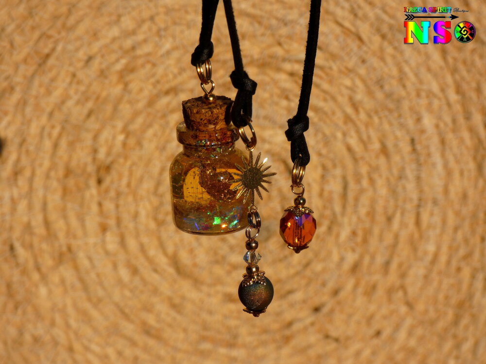 Il s'agit d'une création très originale et Ultra lumineuse. Un superbe flacon style "élixir magique" avec de superbes reflets éthérés multicolores. Un bijou magique aux multiples reflets cristallins et colorés.